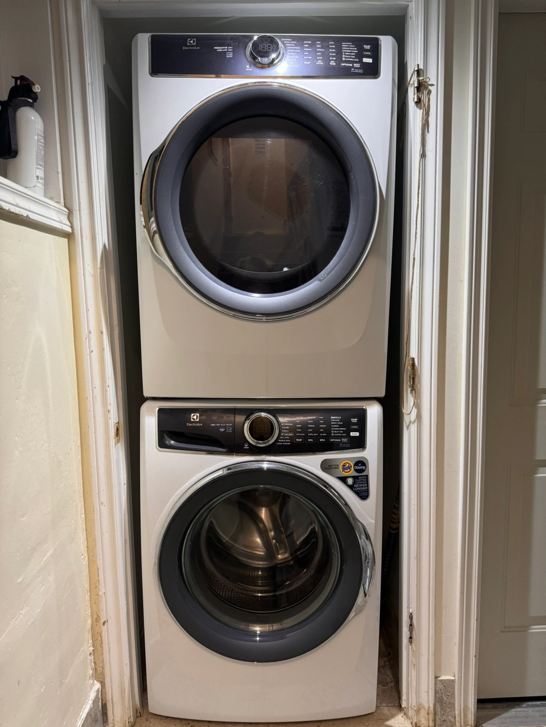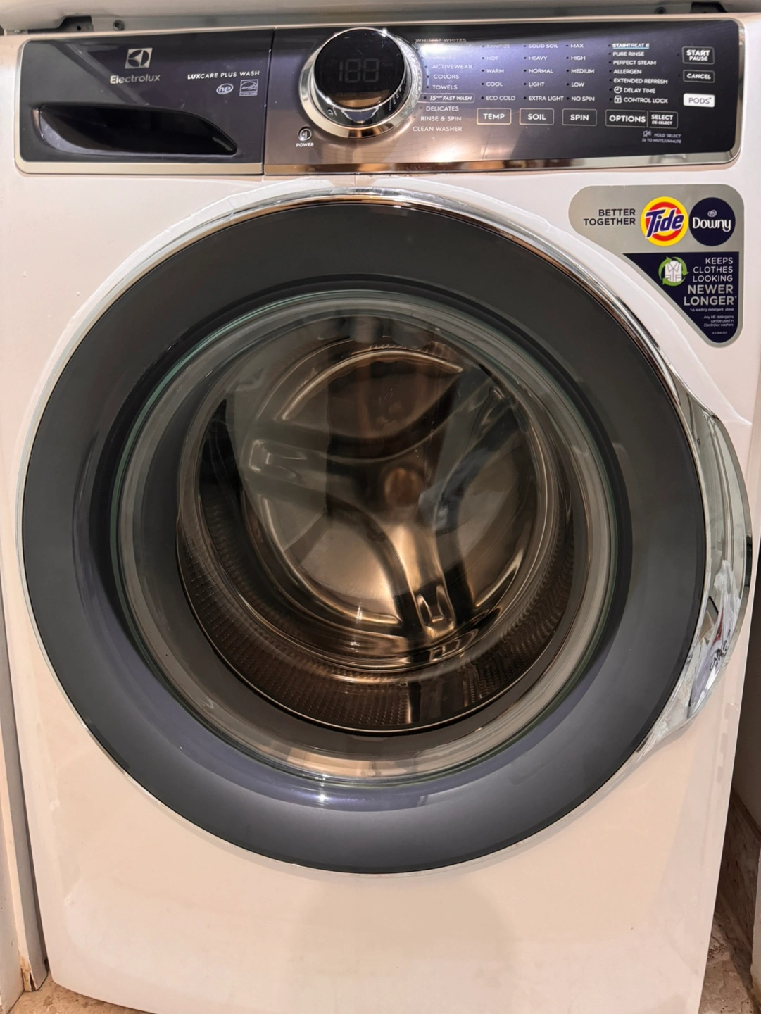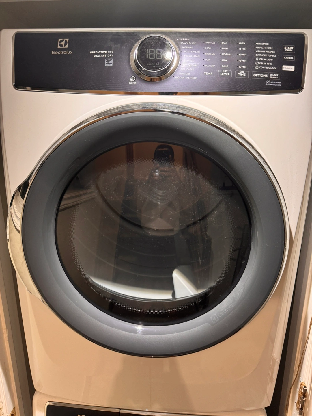 72Stackable Electrolux washer and dryer set in white with chrome accents. The washer and dryer are rarely used but out of warranty. Just 1.5yr old. Both appliances are in great working condition. Separate unit available for $450ea. No delivery. Only pick up.