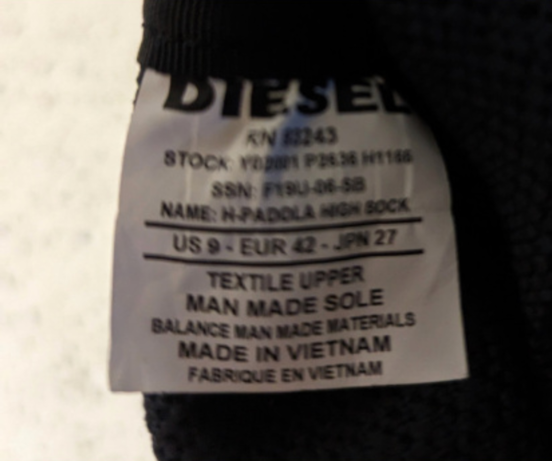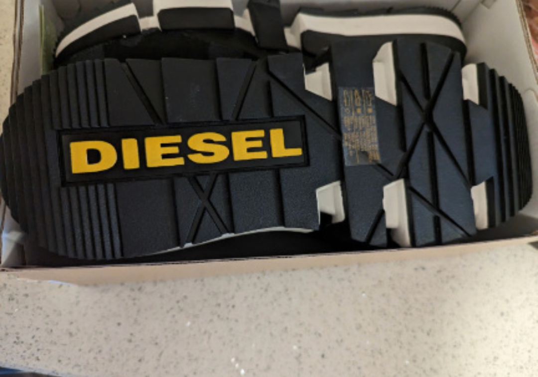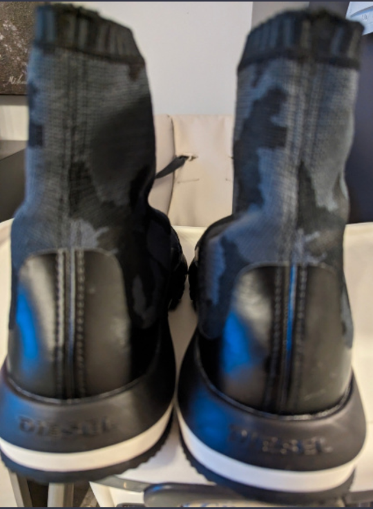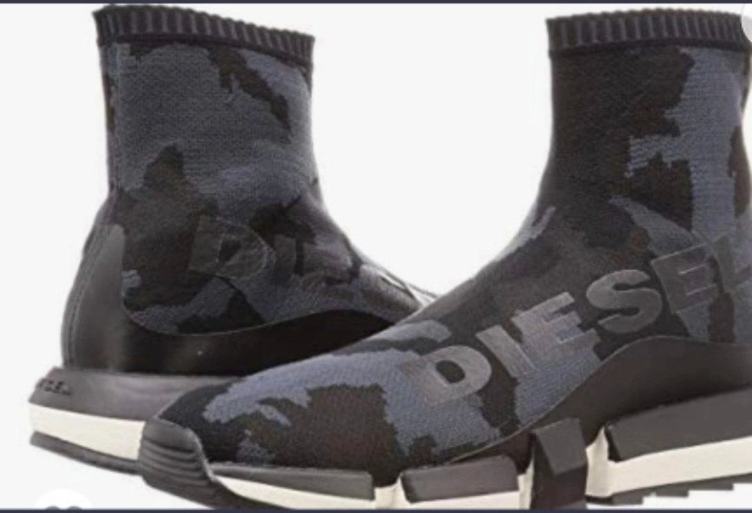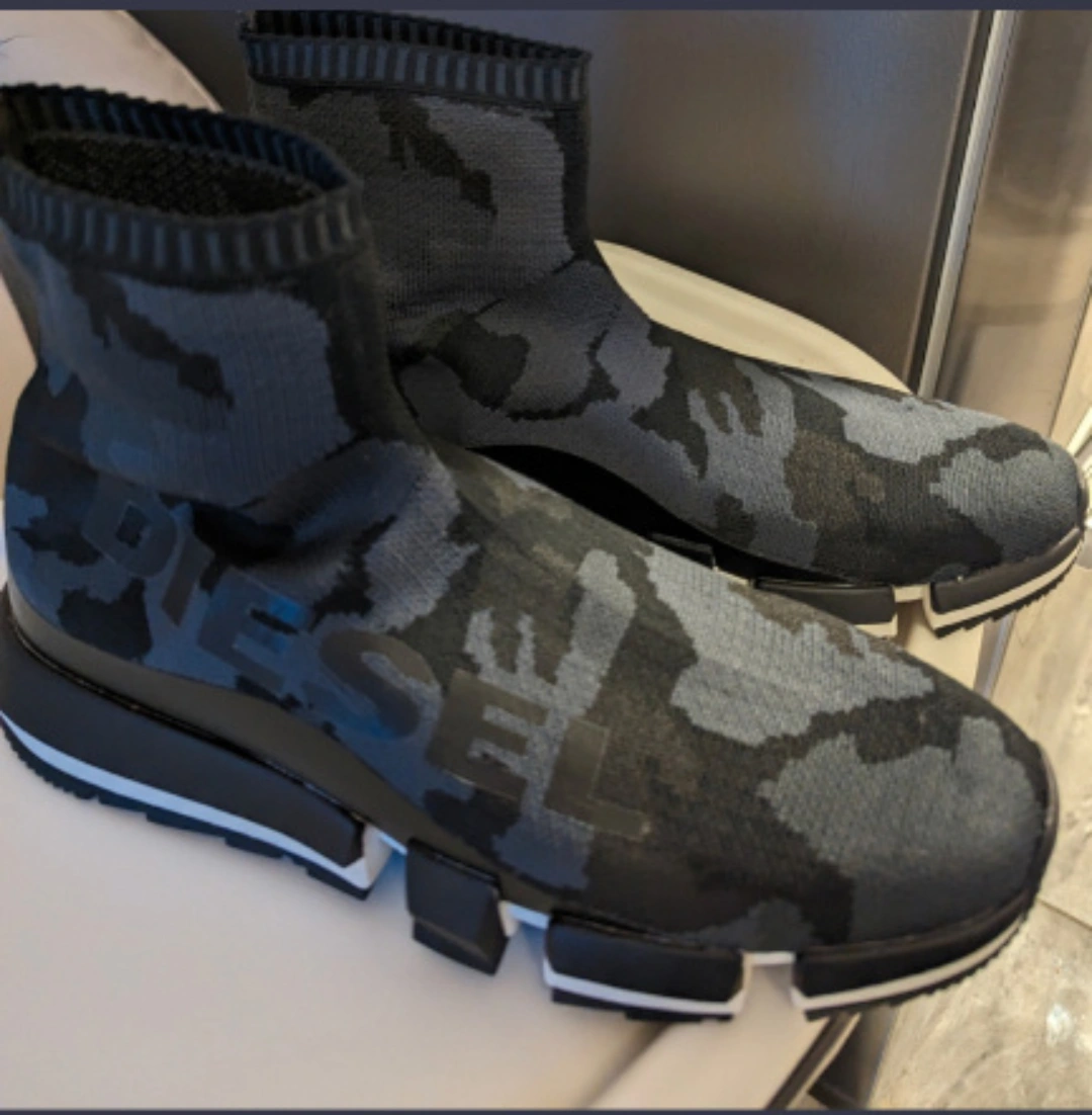 These are Diesel sock sneakers in a black and grey camouflage pattern. They are will make a fantastic addition to your wardrobe. Diesel fuses high-performance technology and superior materials with a contemporary athleisure design. This lightweight sock boot has a breathable, mid-height knit upper, emblazoned with the Diesel logo in contrasting colors. The durable multi-component phylon sole is designed to offer a soft and effortless sensation underfoot. New no box Size: US-9. Eur-42.