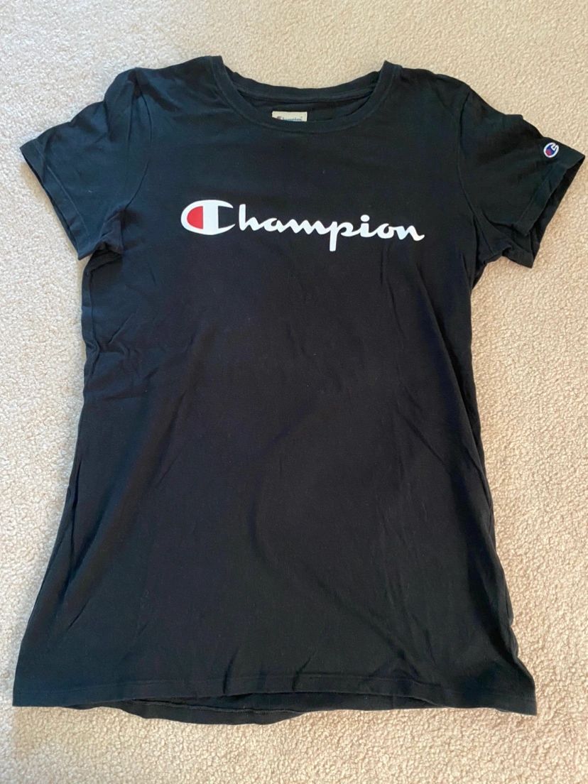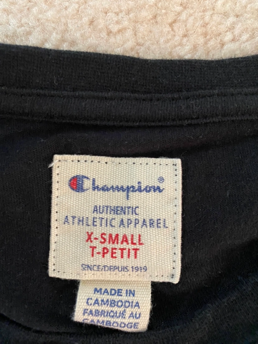 Black Champion t-shirt with the Champion logo on the front. Made in Cambodia. Size X-Small Petite. Short sleeves. Meeting spot is flexible.