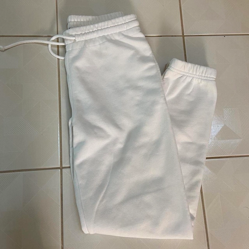 Size XXS. White sweatpants with a drawstring waistband and two pockets on the front. They have a cuffed hem.