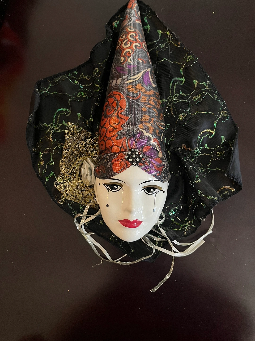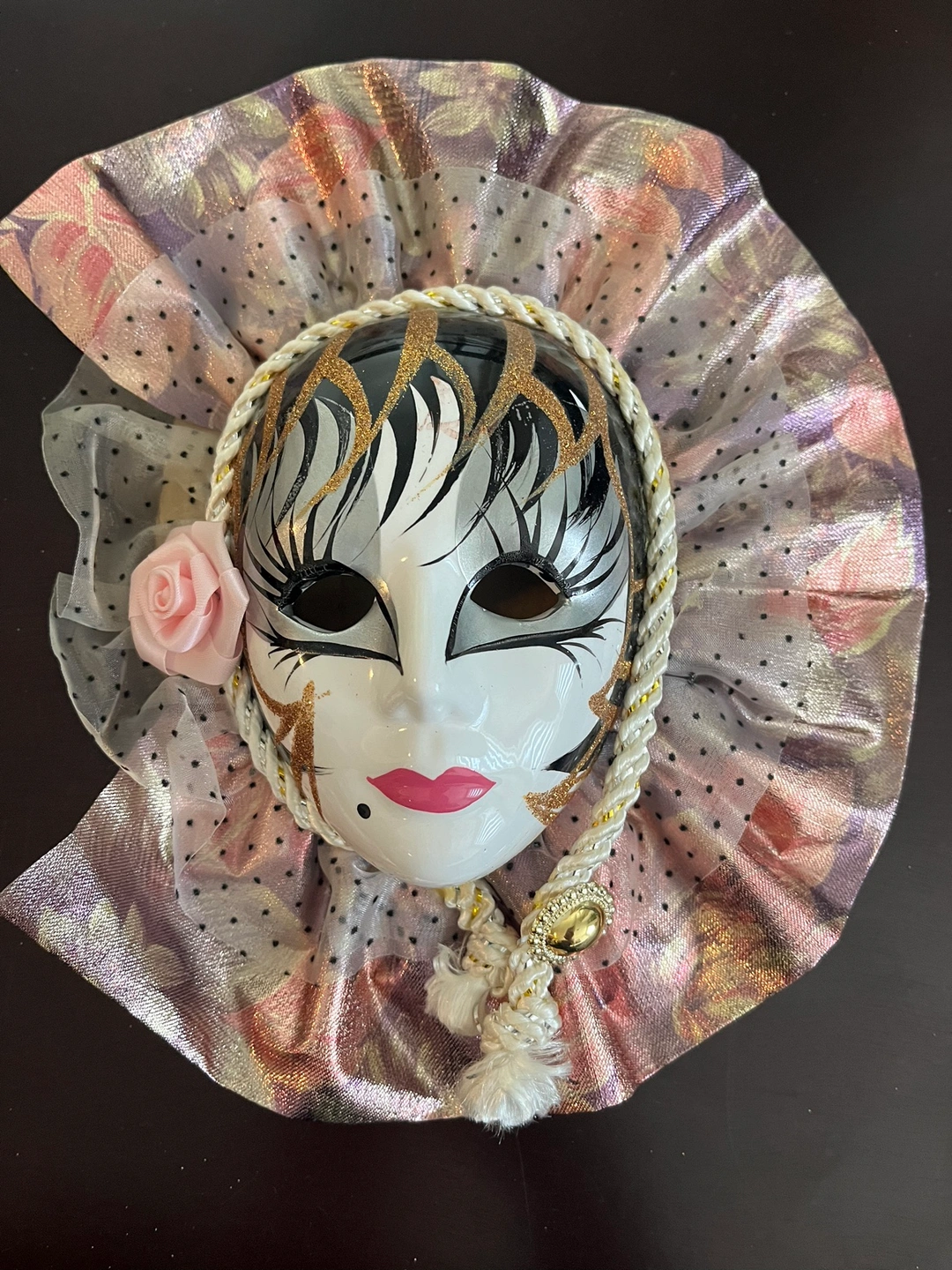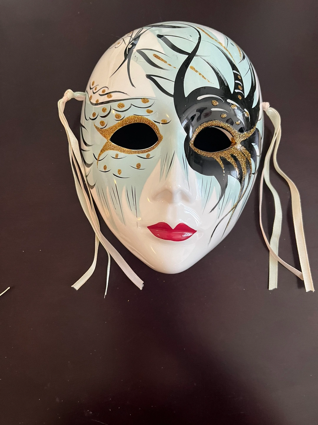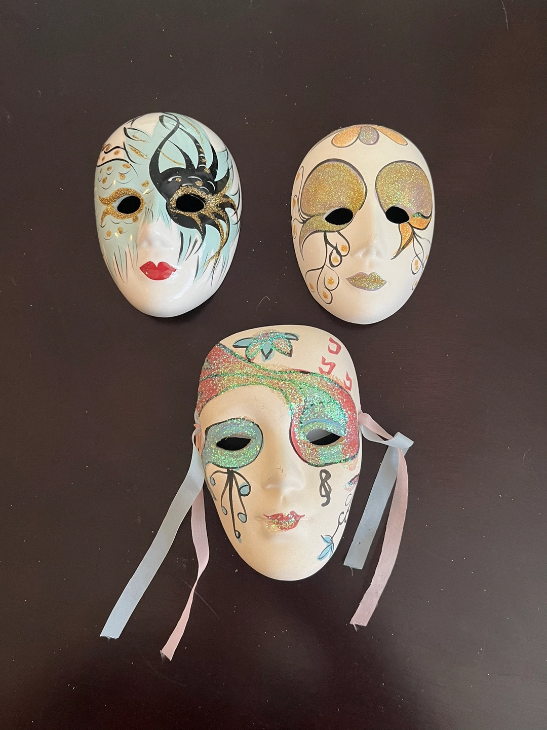 Porcelain Masks with decorative fabric accents. A great set for a whimsical decor theme or masquerade ball party. The masks come with delicate fabric accents and are in good condition.