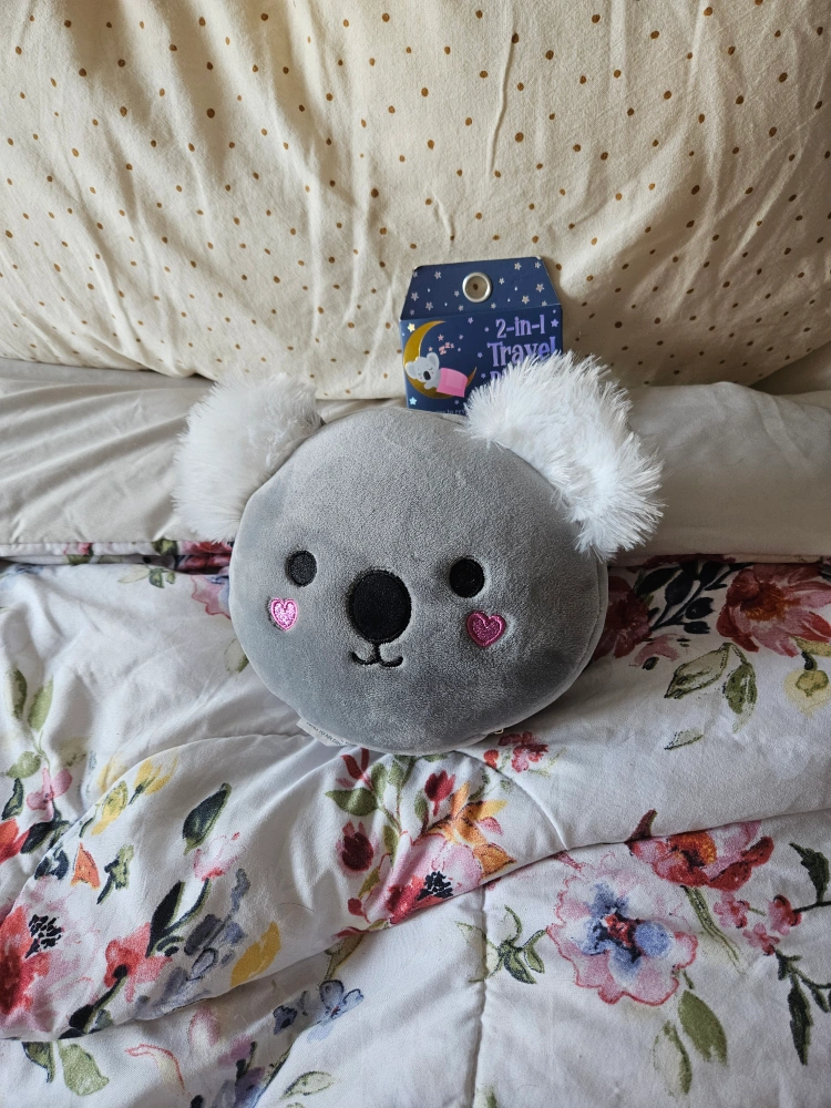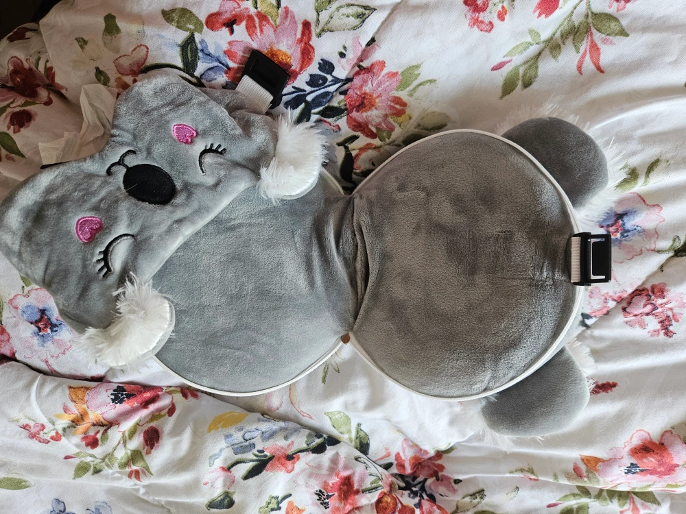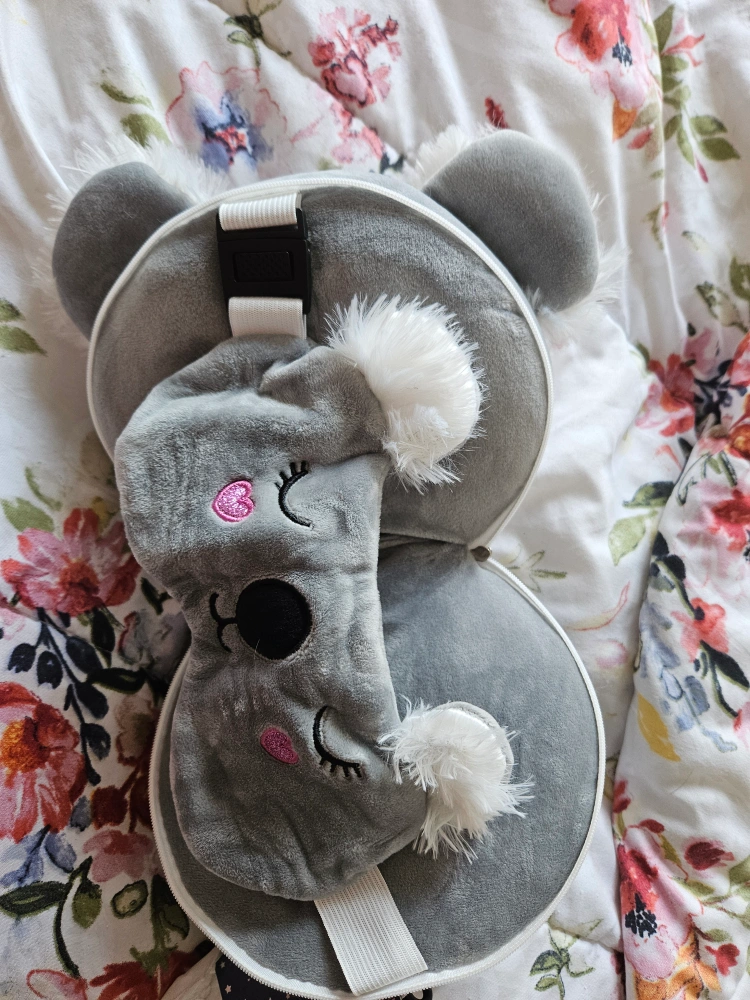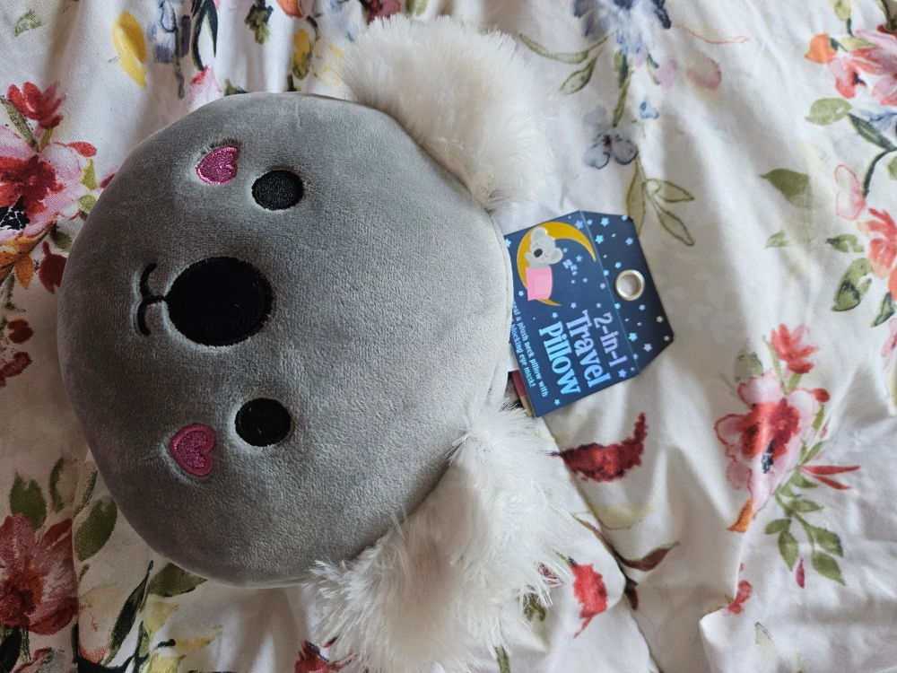 This is a cute and cuddly Koala travel pillow with a zipper for built-in blocking eye mask. Perfect for travel or home use!