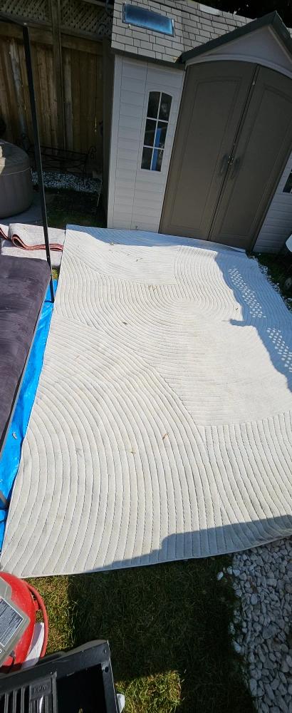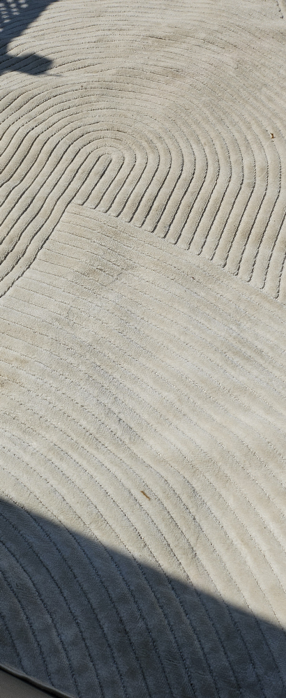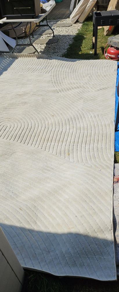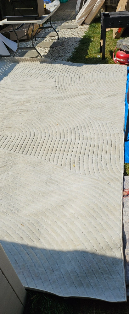 A large white rug with a textured pattern. It is in good condition and would be a great addition to any home.