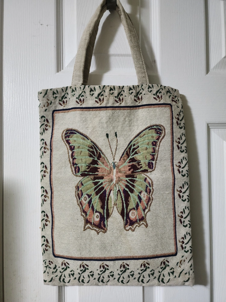 A reusable tote bag with a beautiful tapestry design featuring a butterfly, and soft velvet material on the other side. The bag has never been used, no rips or tears. It is perfect for carrying small items, and its unique design makes it a great statement piece. Cash & pick-up only (meet at Pimisi East station)