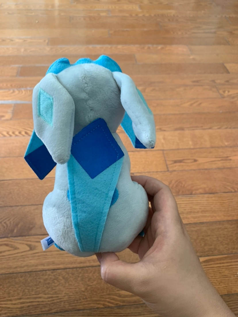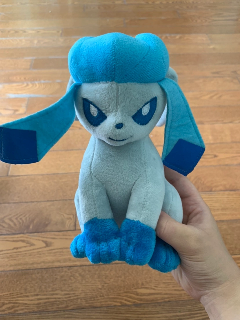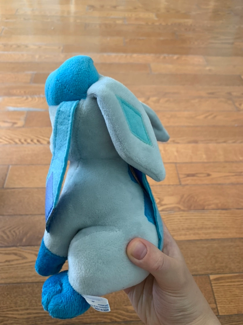 A plush toy of the Pokemon Glaceon. It is blue and white and measures approximately 8 inches tall in height, overall in decent condition.