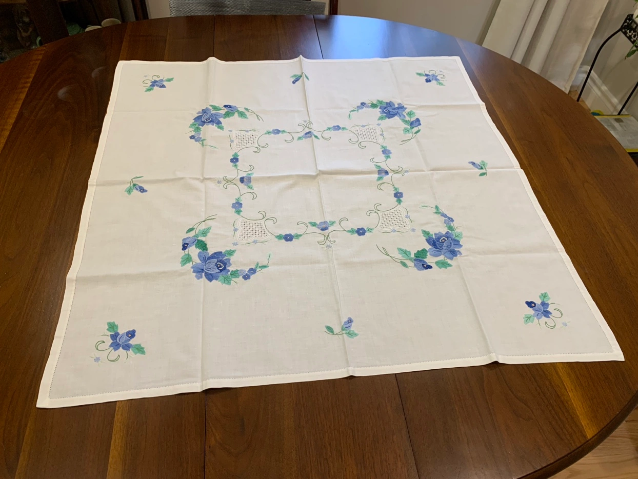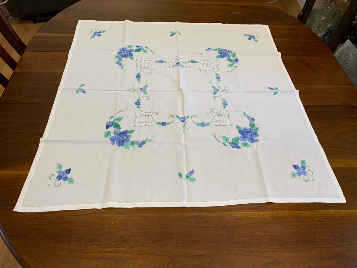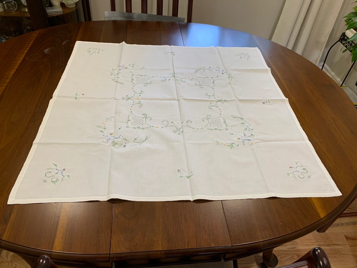 In excellent like new condition, this hand made tablecloth measures 32” by 33”.
