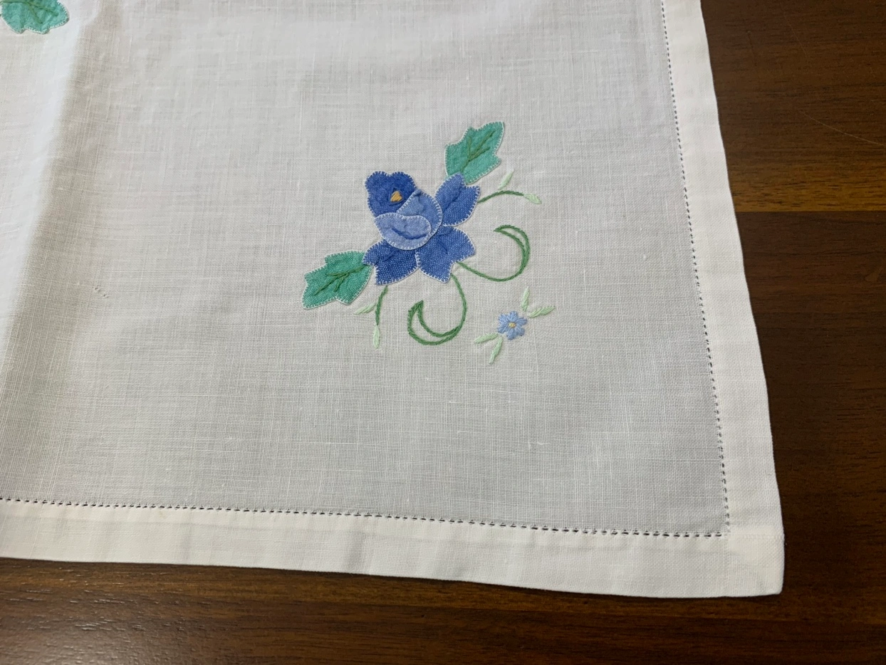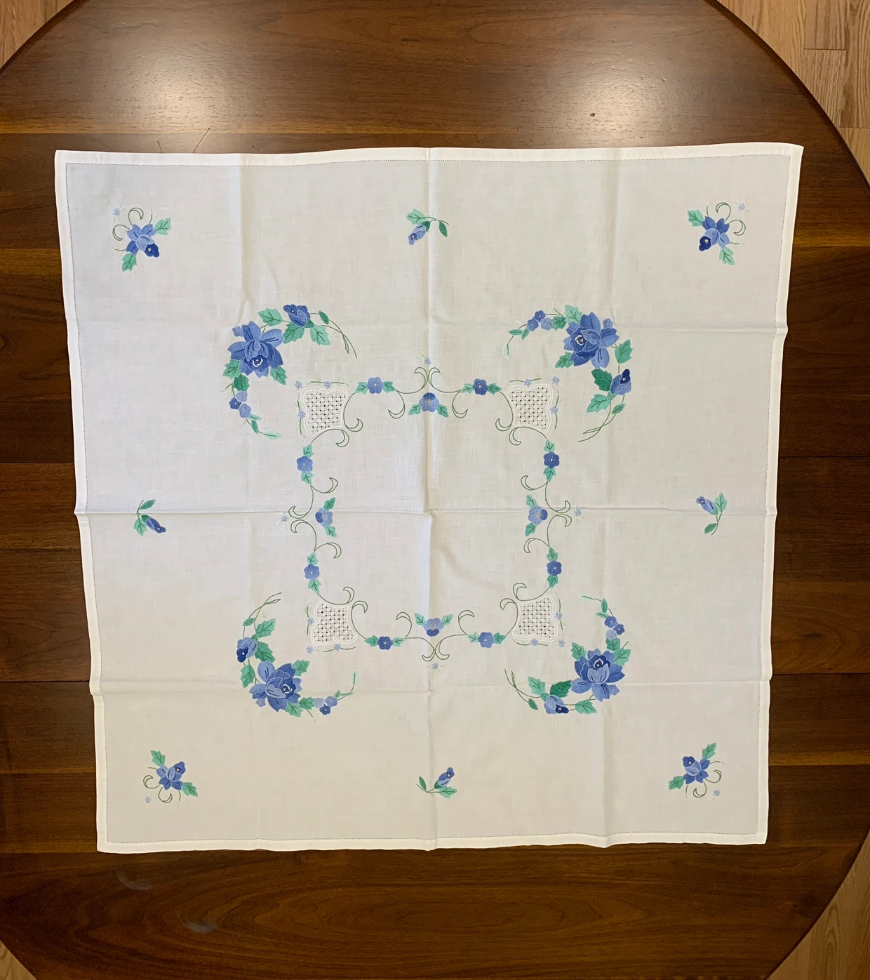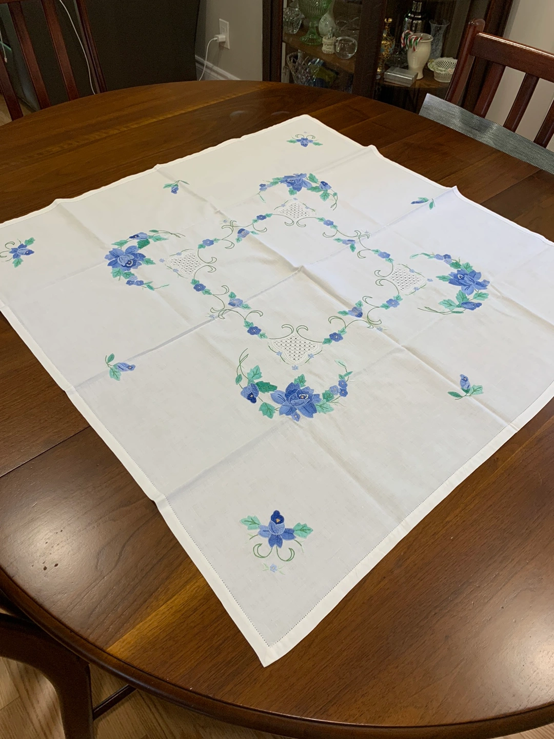 In excellent like new condition, this hand made tablecloth measures 32” by 33”.