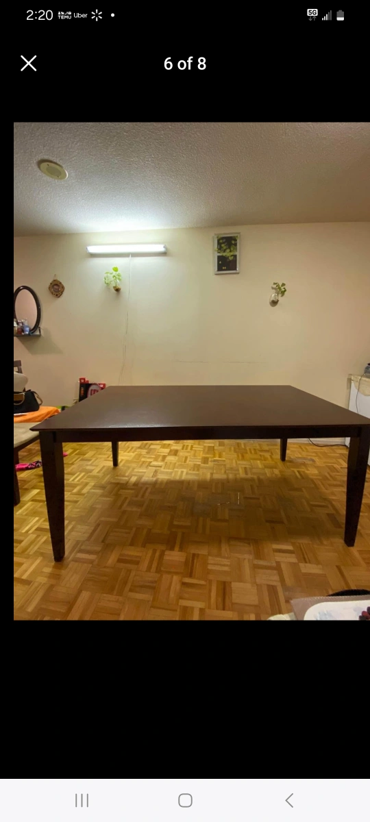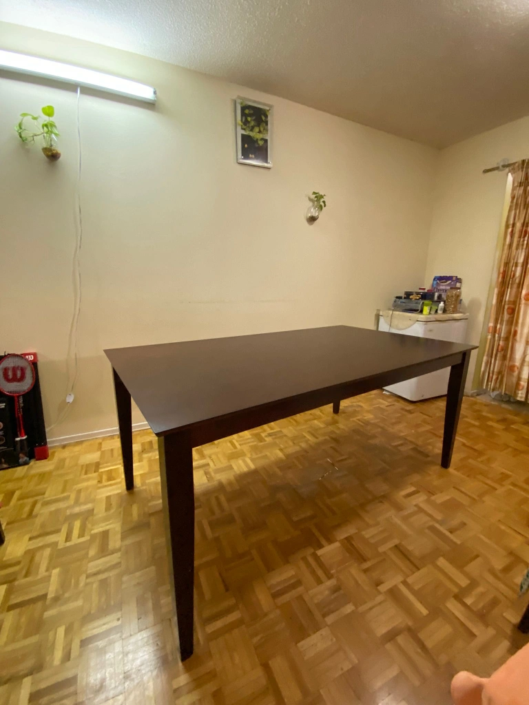Large solid wood dining room table. Can seat 8 comfortably. Table is a dark brown colour.