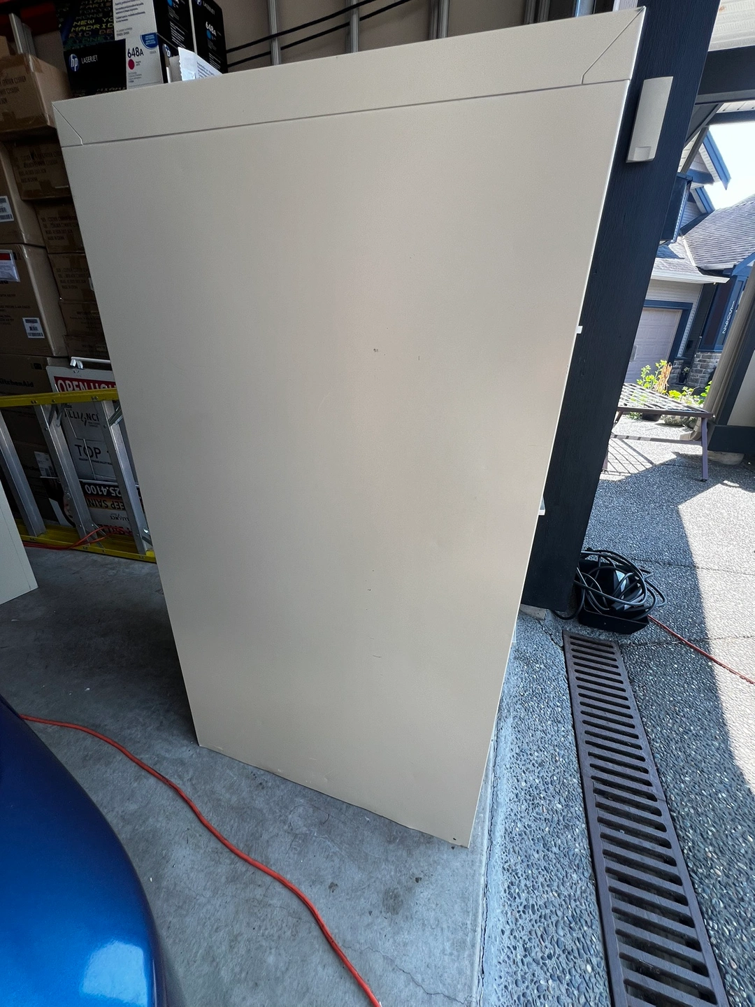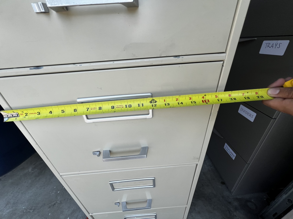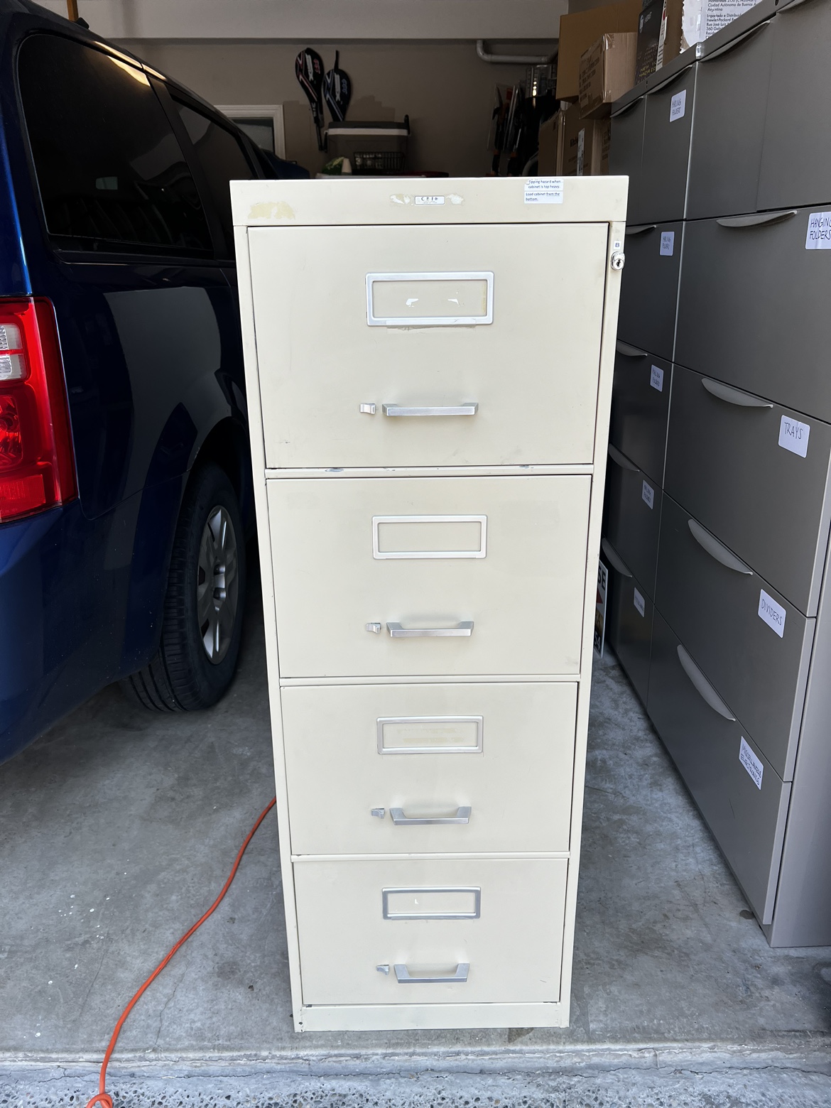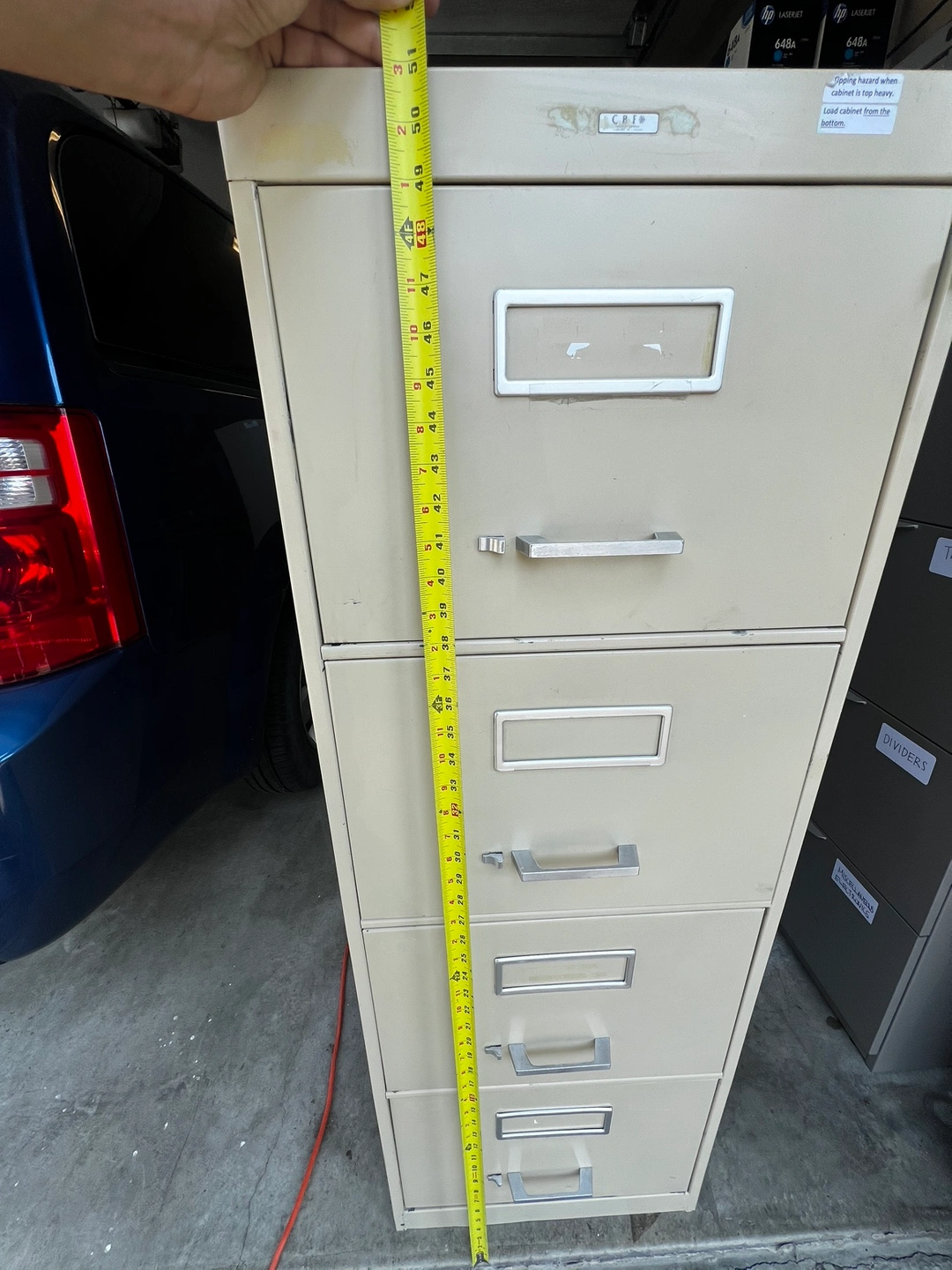 73Four-drawer filing cabinets in good condition. It has some minor scratches and wear and tear. It is approximately 48 inches tall. It has a locking mechanism. Only one left Pickup 150 and 69 avenue