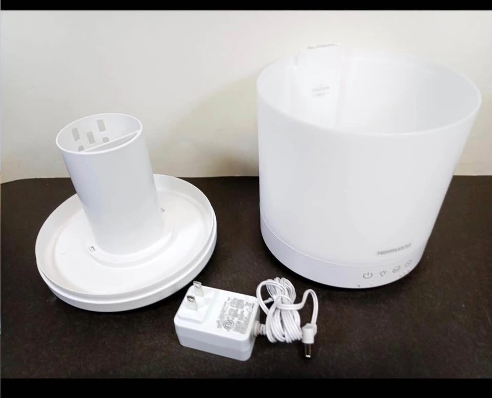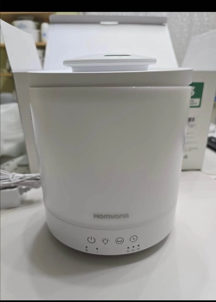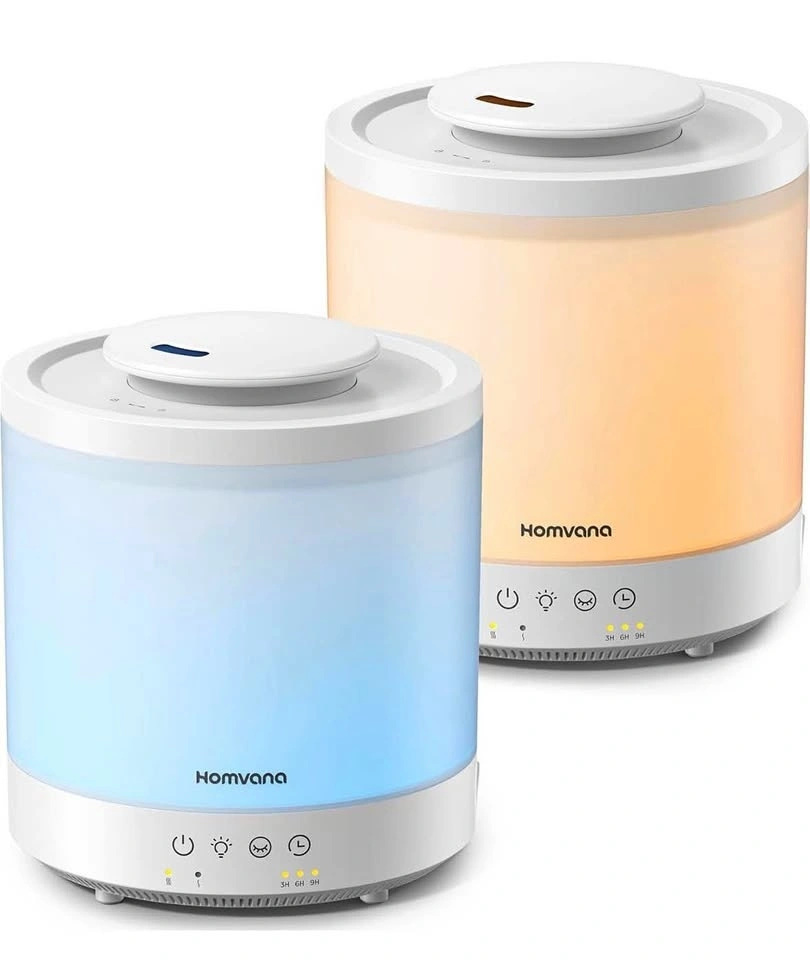 Versatile Homvana 1.5L humidifier with 3-in-1 functions: humidifier, aroma diffuser, and night light. Includes a timer for 3, 6, or 9 hours. Measures about 6.59 inches wide and 7.75 inches tall.