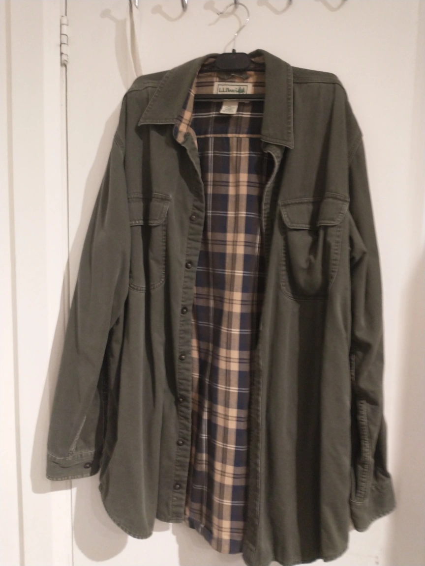 522Green outside, flannel lining, button closure Lightweight jacket Great condition Smoke free home Cash payment please