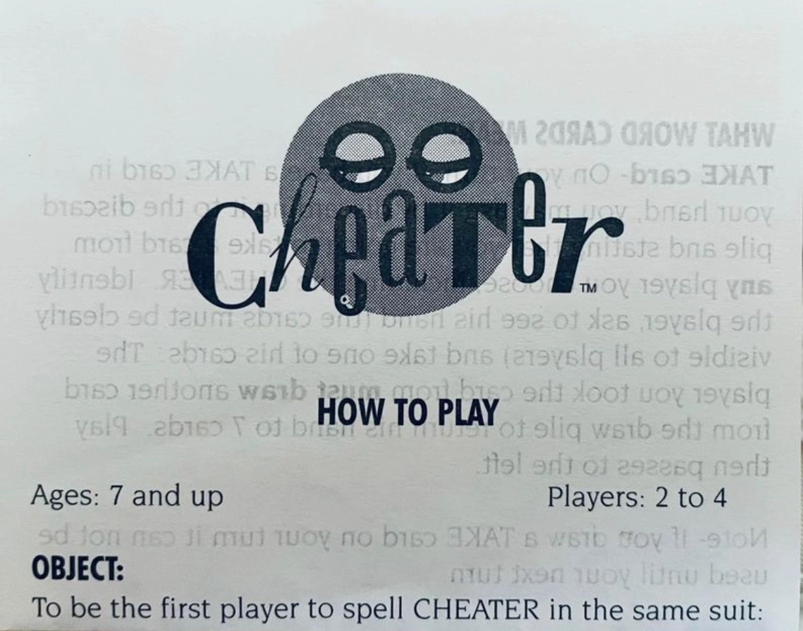 Object: Be the first player to spell CHEATER in the same colour suit.