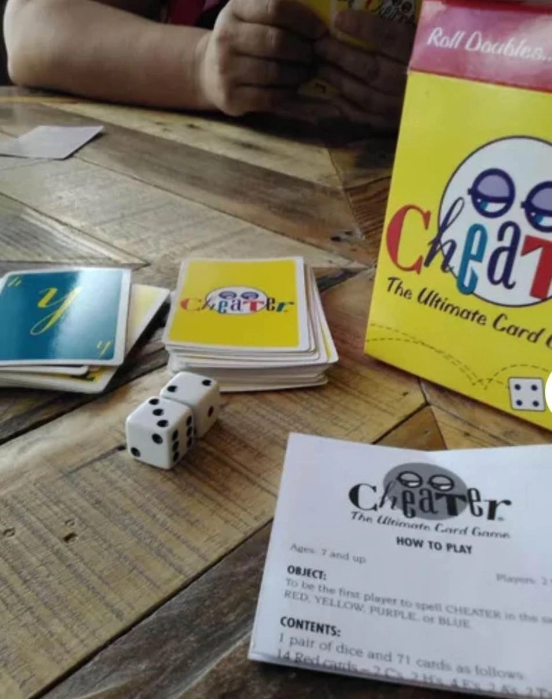 Cheater Card Game is a Rummy type card game with one person having special powers. There are 4 suits of cards with the letters C, H, E, A, T, R on them. With 7 cards in hand the goal is to acquire the cards to spell CHEATER in one suit (colour). Perfect for rainy days or nights at the cottage, traveling in the backseat of a car or playing this instead of a video game.