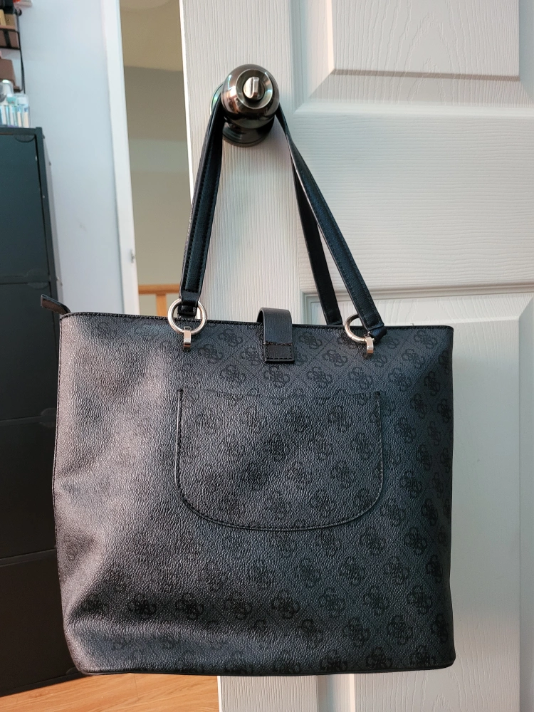 Large tote bag with a zipper closure, black leather handles, and a black and silver Guess logo. Comes with a removable feather charm. in good condition. for pick up only