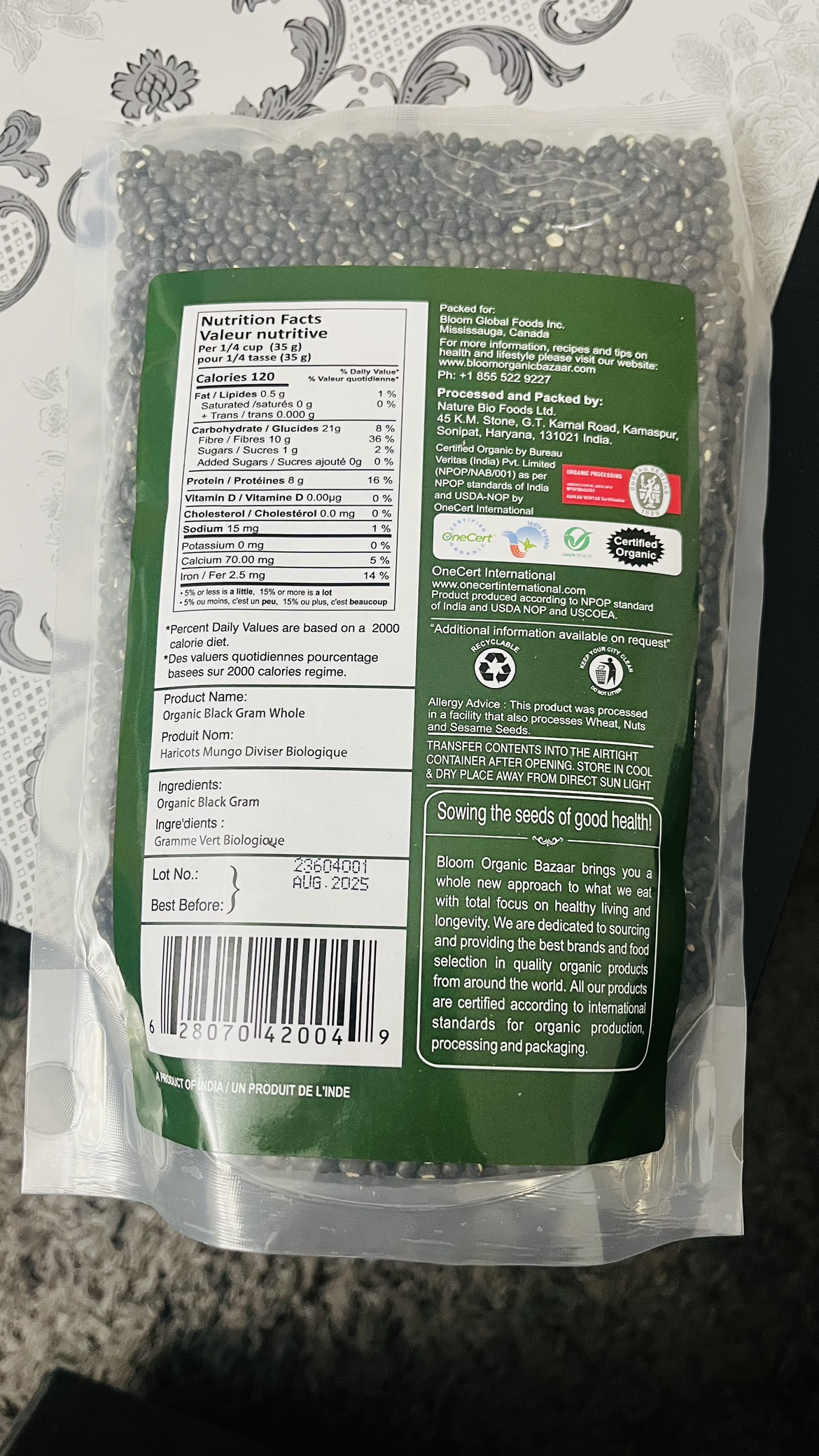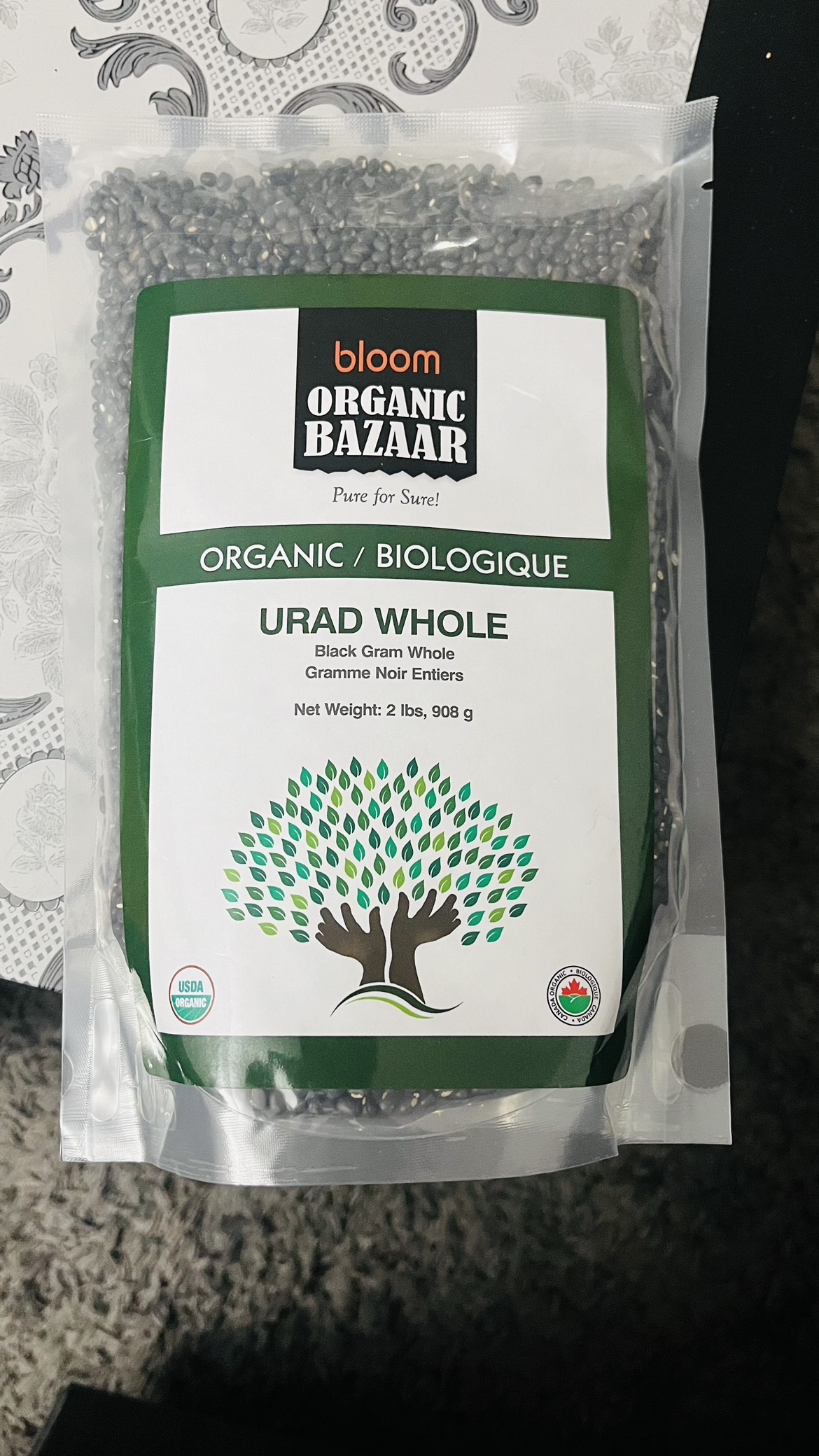 Organic whole black gram from Bloom Organic Bazaar. Net weight: 2 lbs, 908 g.