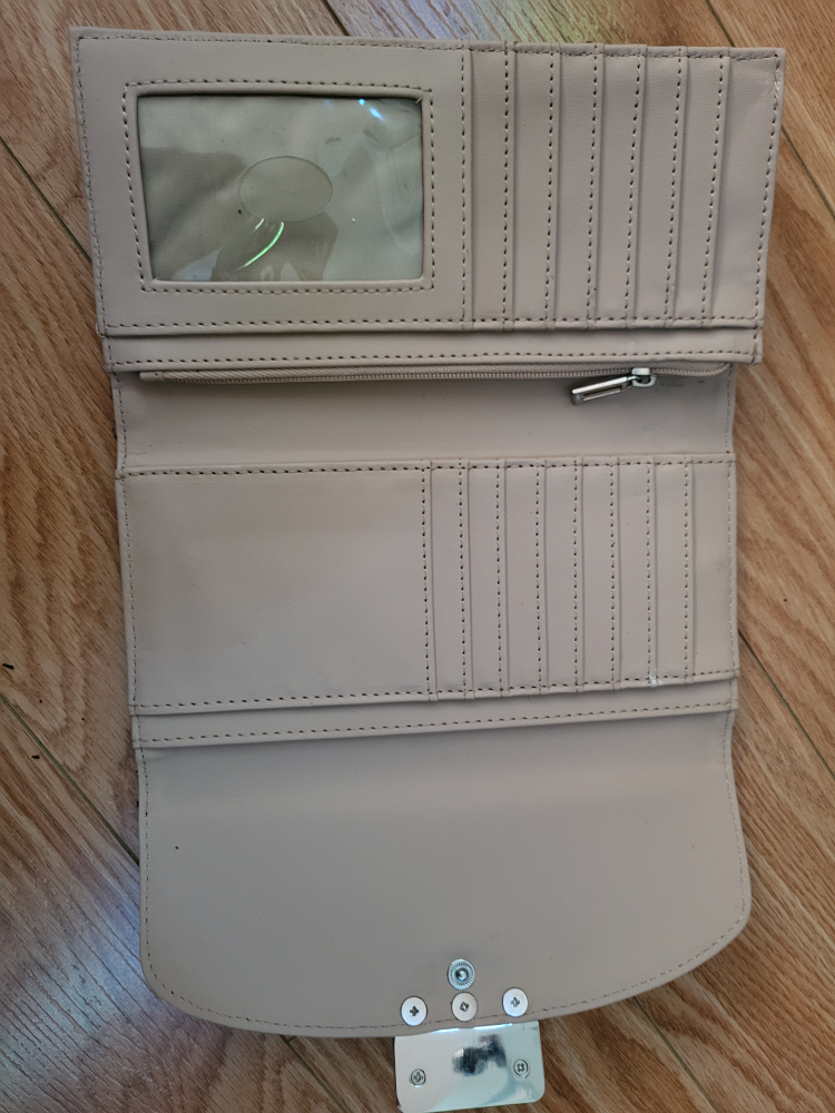 Black and brown wallet with silver hardware and a zippered coin purse. The wallet has multiple card slots, bill compartments, and a clear ID window.