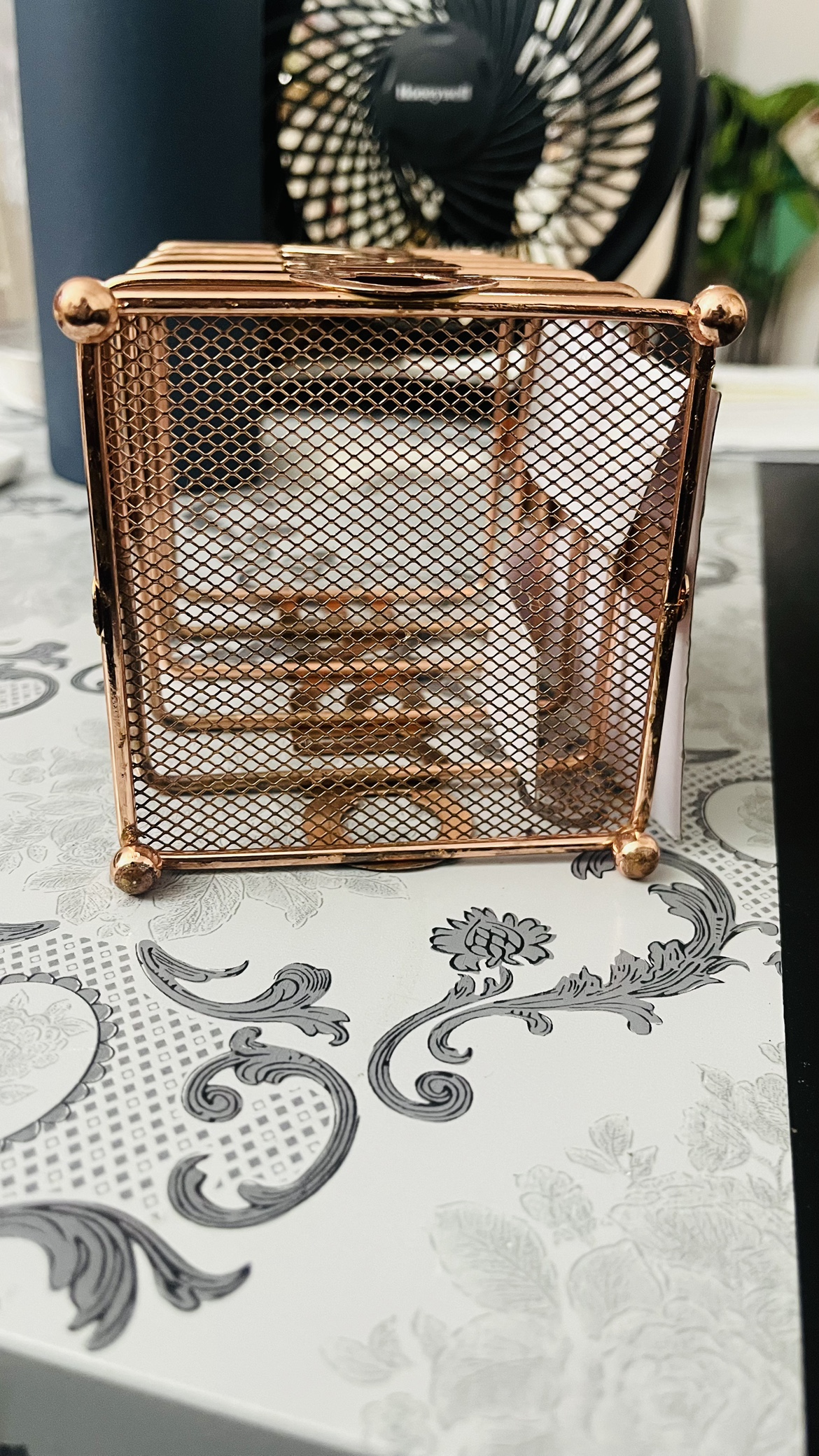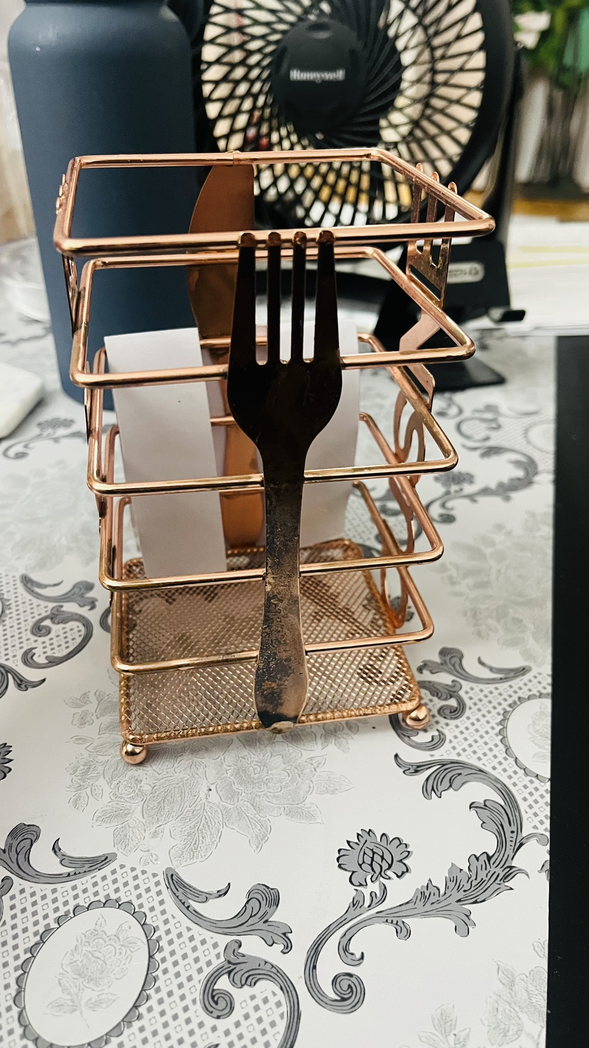 This is a rose gold coloured utensil holder. It is made of wire and is suitable for storing forks, knives, and spoons. It is in good condition. It comes with the original tag.