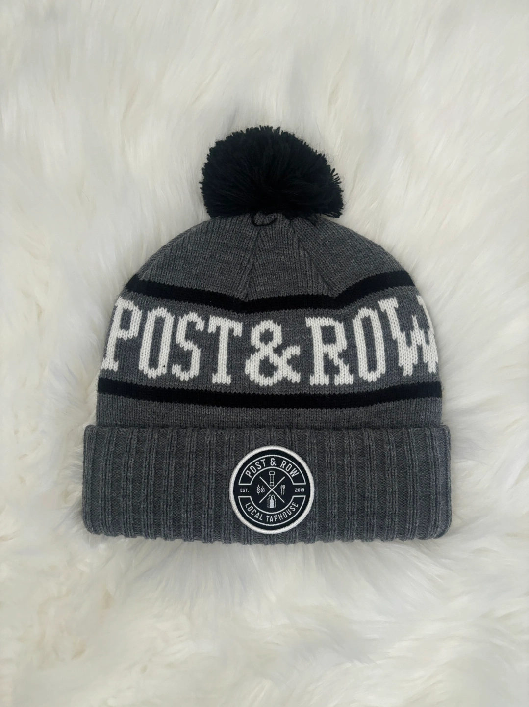 Grey beanie with a pom pom and a Post & Row logo Brand New High Quality Pet & Smoke Free Home