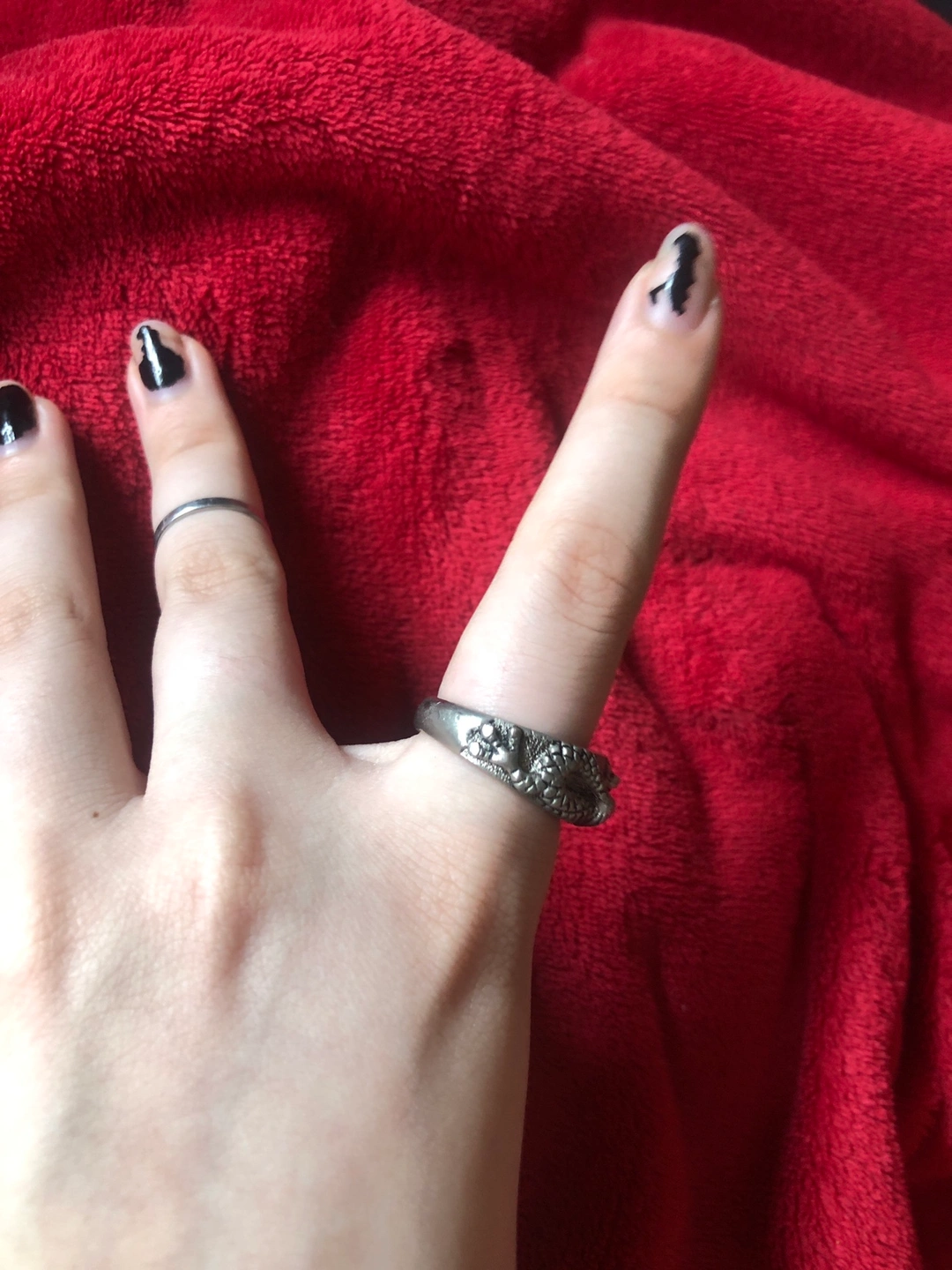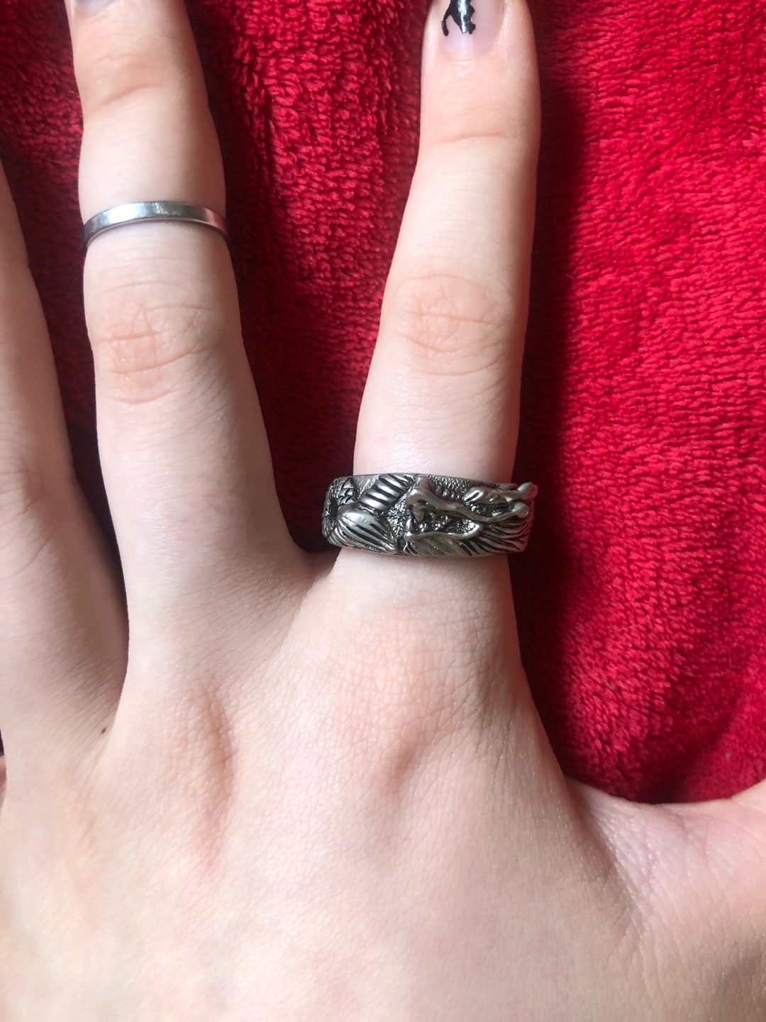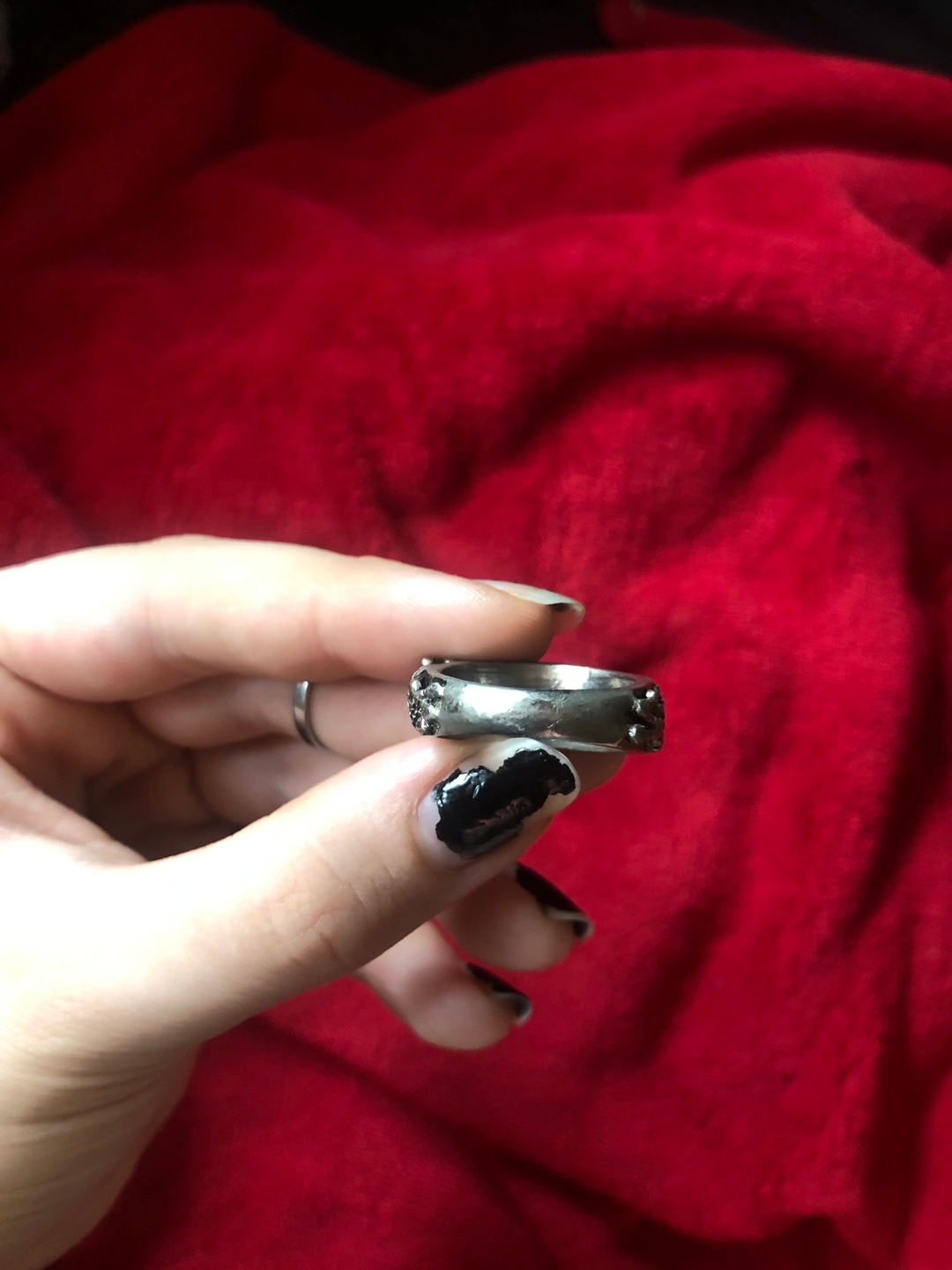 i thrifted this ring a long time ago so i’m unsure of the material, but it never stained my fingers so i’m guessing it’s a material that’s much more resistant to oxidization