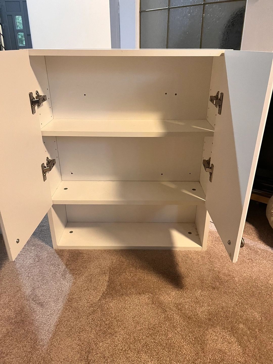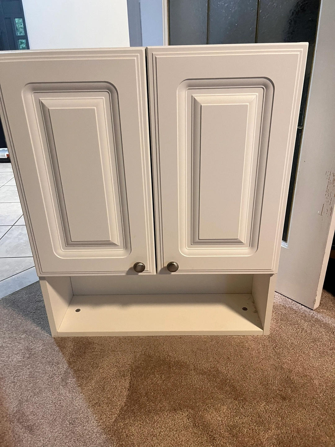 Small bathroom cabinet with 2 doors and 3 shelves. 22 inches wide. Great for storing toiletries and other bathroom essentials.