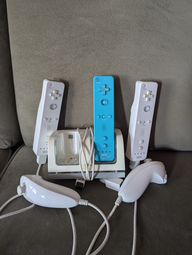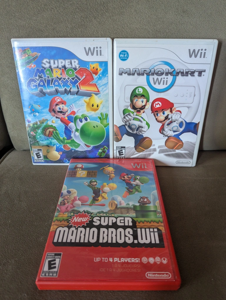 Includes console, 3 controllers, 3 remote controllers, charging station, and 3 games (Super Mario Galaxy 2, Mario Kart Wii, New Super Mario Bros. Wii)