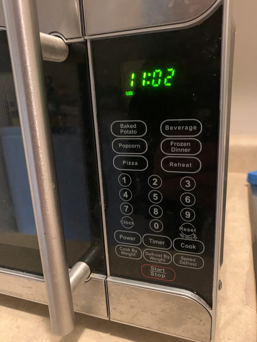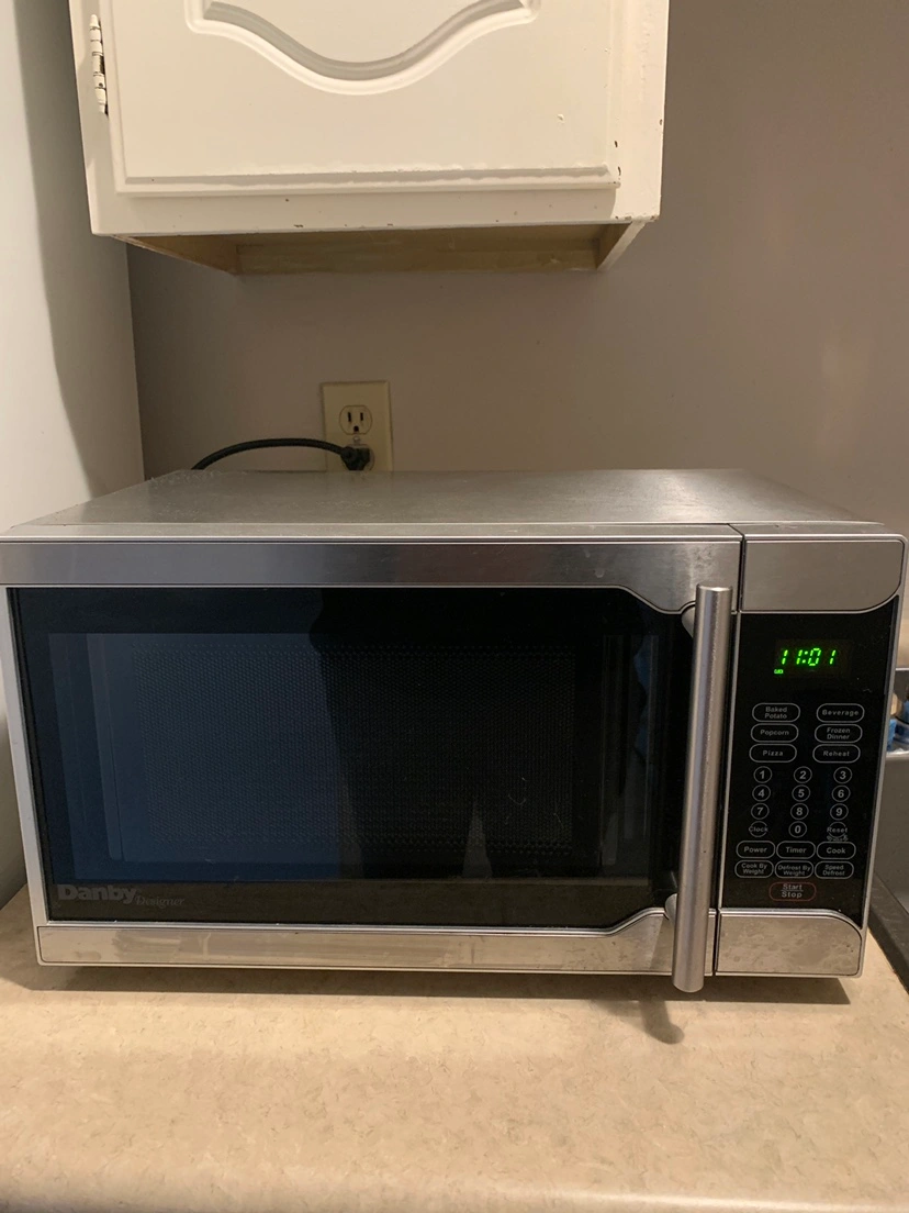 Microwave with stainless steel finish and a digital clock display. In very good condition.