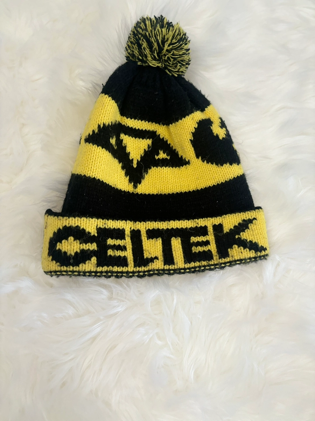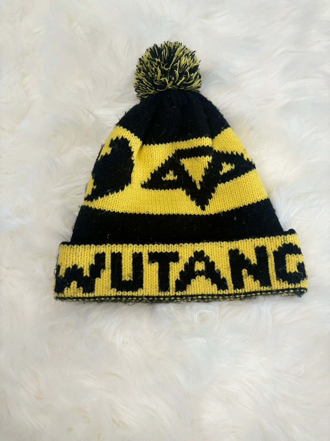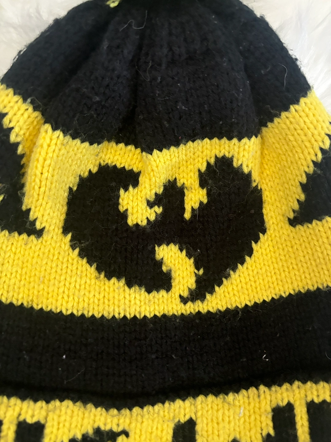 Black and yellow knitted beanie with a pompom on top. Features the Wu-Tang Clan logo on the front and "Wu-Tang" written on the back. The beanie is made by Celtek.