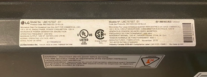 LG LMC1575ST Countertop Microwave, 1.5 cu. ft. Capacity, 1200W Watts, Stainless Steel colour Porch pick up preferred. Willing to meet in the neighbourhood depending on distance and weather if purchasing multiple items. Additional discounts for multiple items may be arranged. Cash or e-transfer accepted.