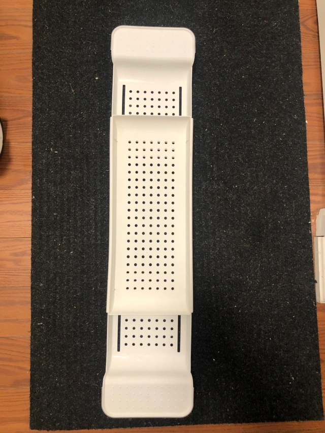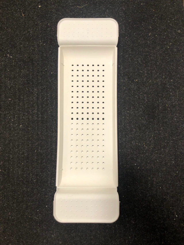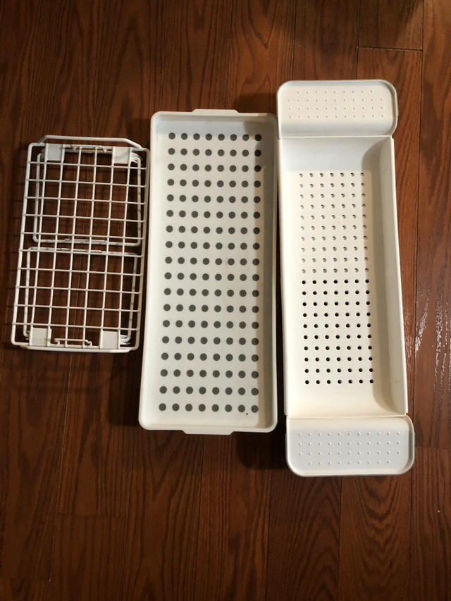 One white wire under-sink organizers, one white plastic under-sink organizer, and one extendable rack for your sink or bathtub.