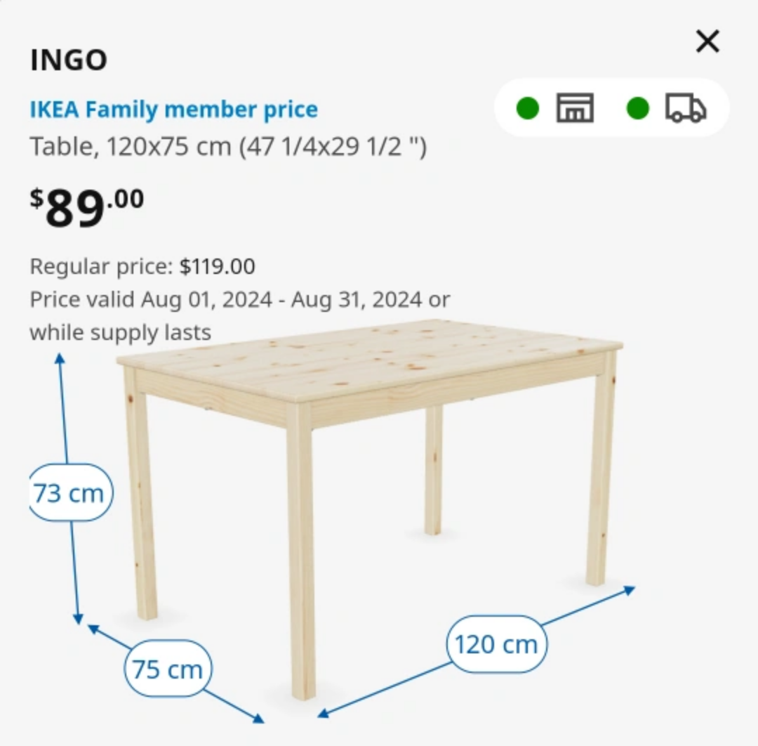 1 / 11 / 1Buy & SellIkea wooden table for 4Ikea wooden table for 4$45Ikea Pine Wooden Table for small family or apt. no chairs available.ConditionLike newWHERE TO MEETCheck LocationView MapSELLERRastaLionJane Heights1149 reviews1 chats·0 favorites·20 viewsSEND CHAT TO SELLERHi RastaLion! I’m interested in your listing.Hi RastaLion! I’m interested in your listing.Get the Karrot app to chatSign In to chat