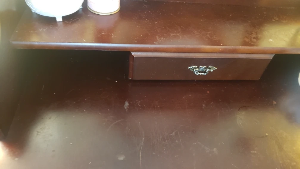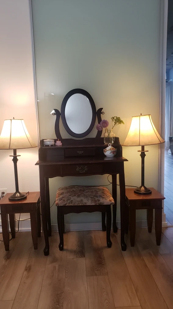 Vanity set with a mirror, stool and two lamps. The vanity table has a single drawer. The set is in good used condition.