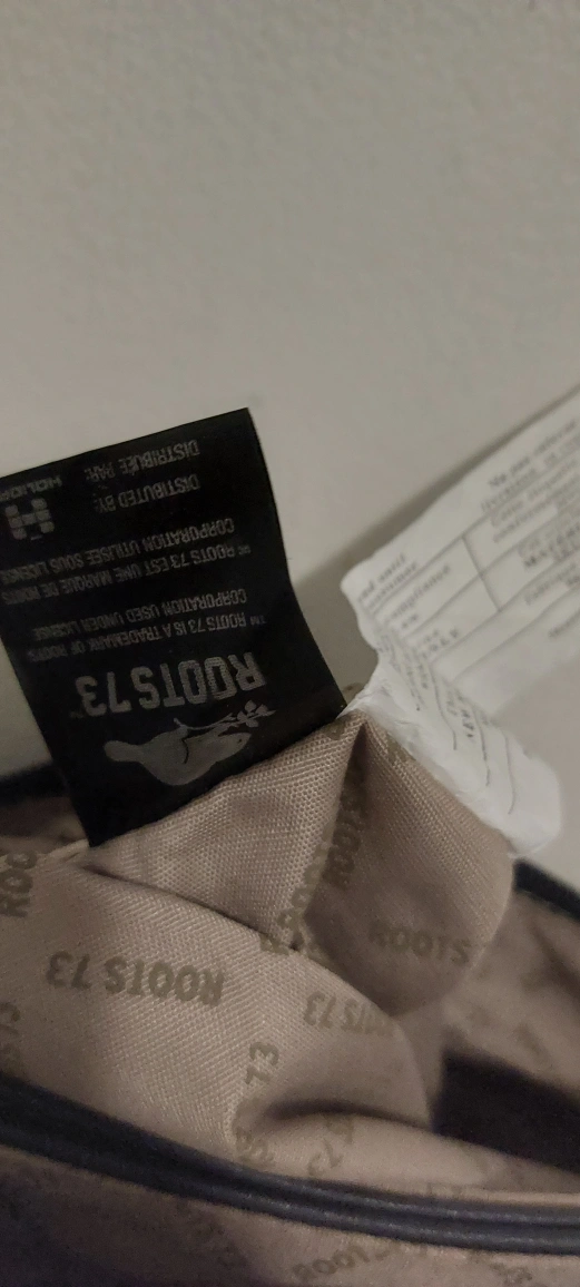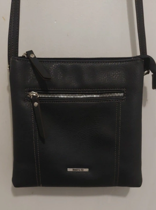 Small navy blue crossbody bag with a zipper closure and adjustable strap. The interior of the bag has a zippered pocket and a small open pocket.