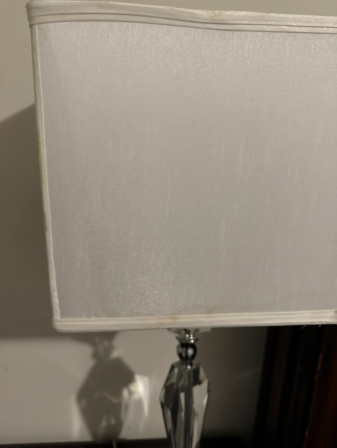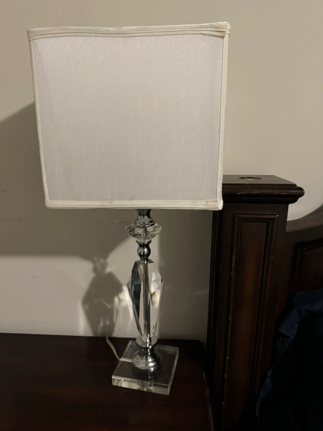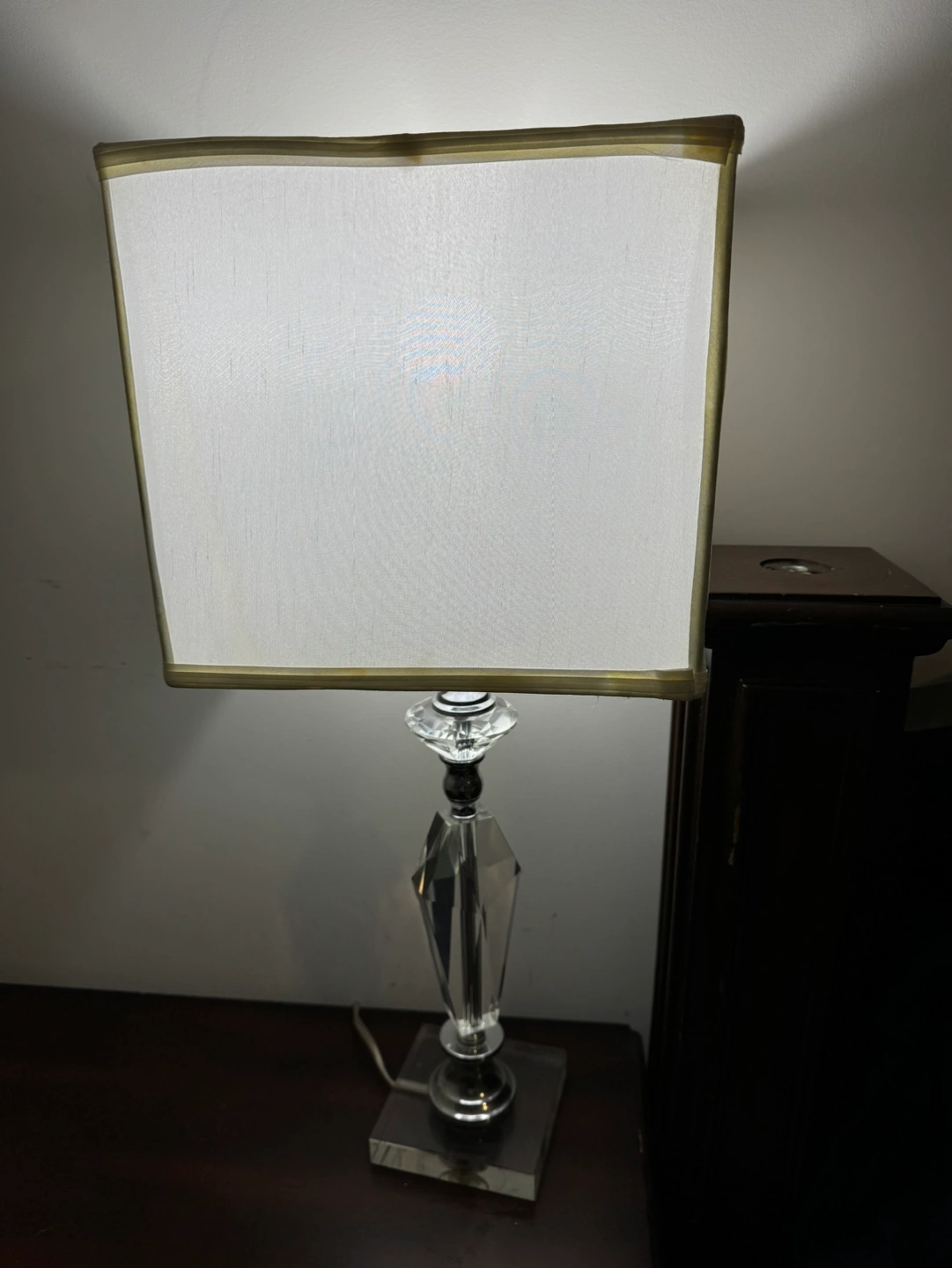 This is a beautiful table lamp with a crystal base and white lampshade. It is perfect for adding a touch of elegance to any room. 2 in total. Please see pictures for details