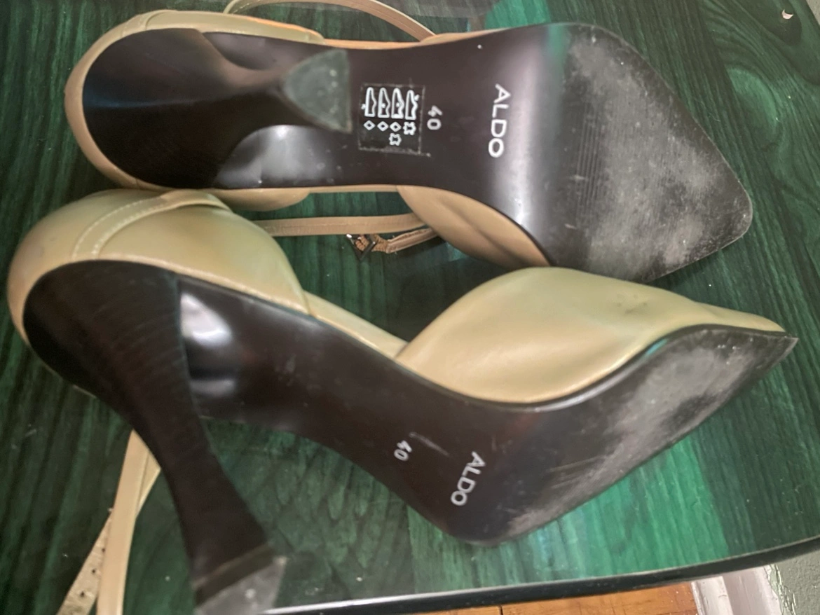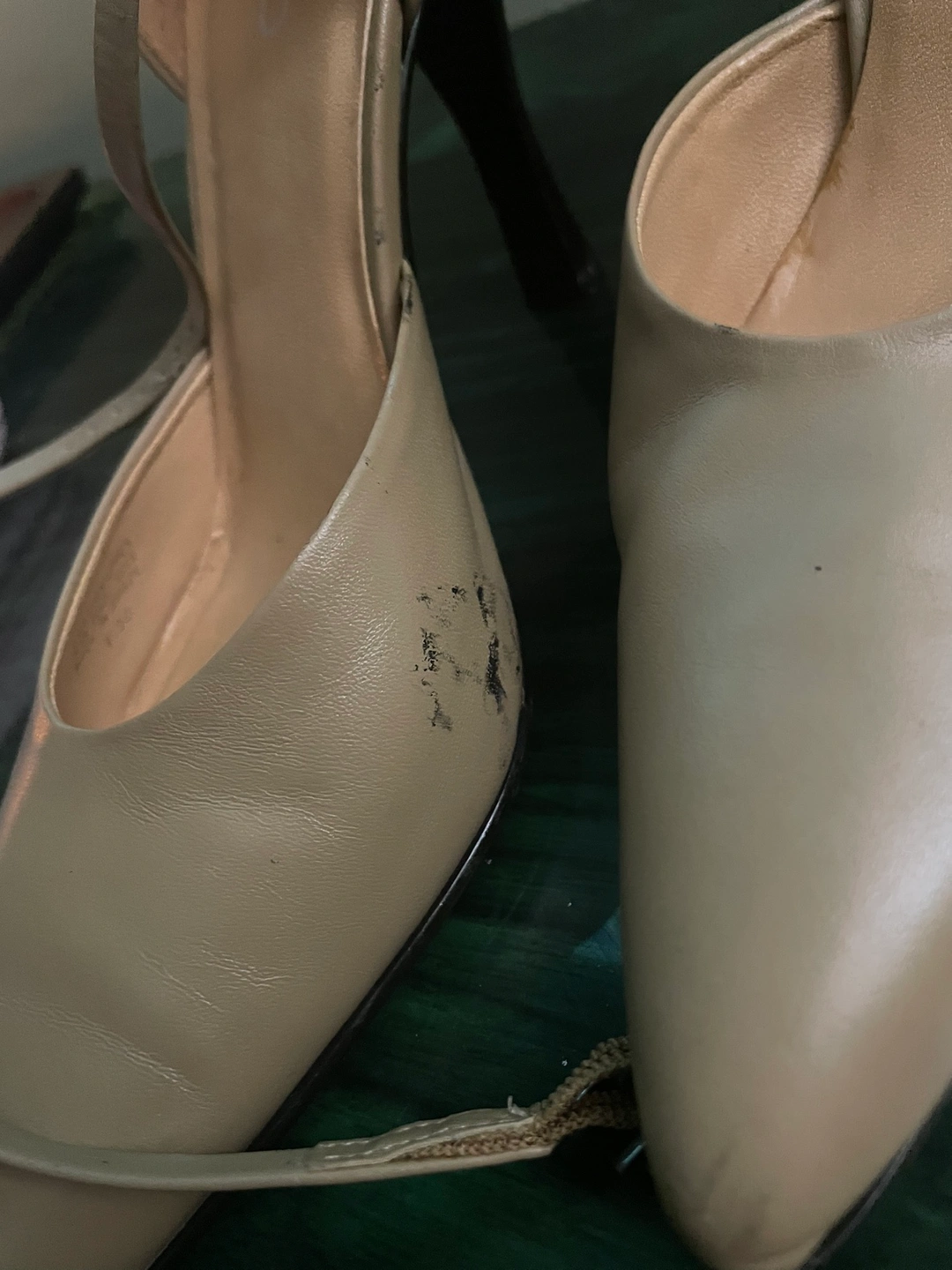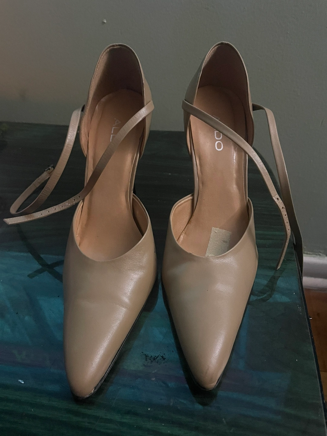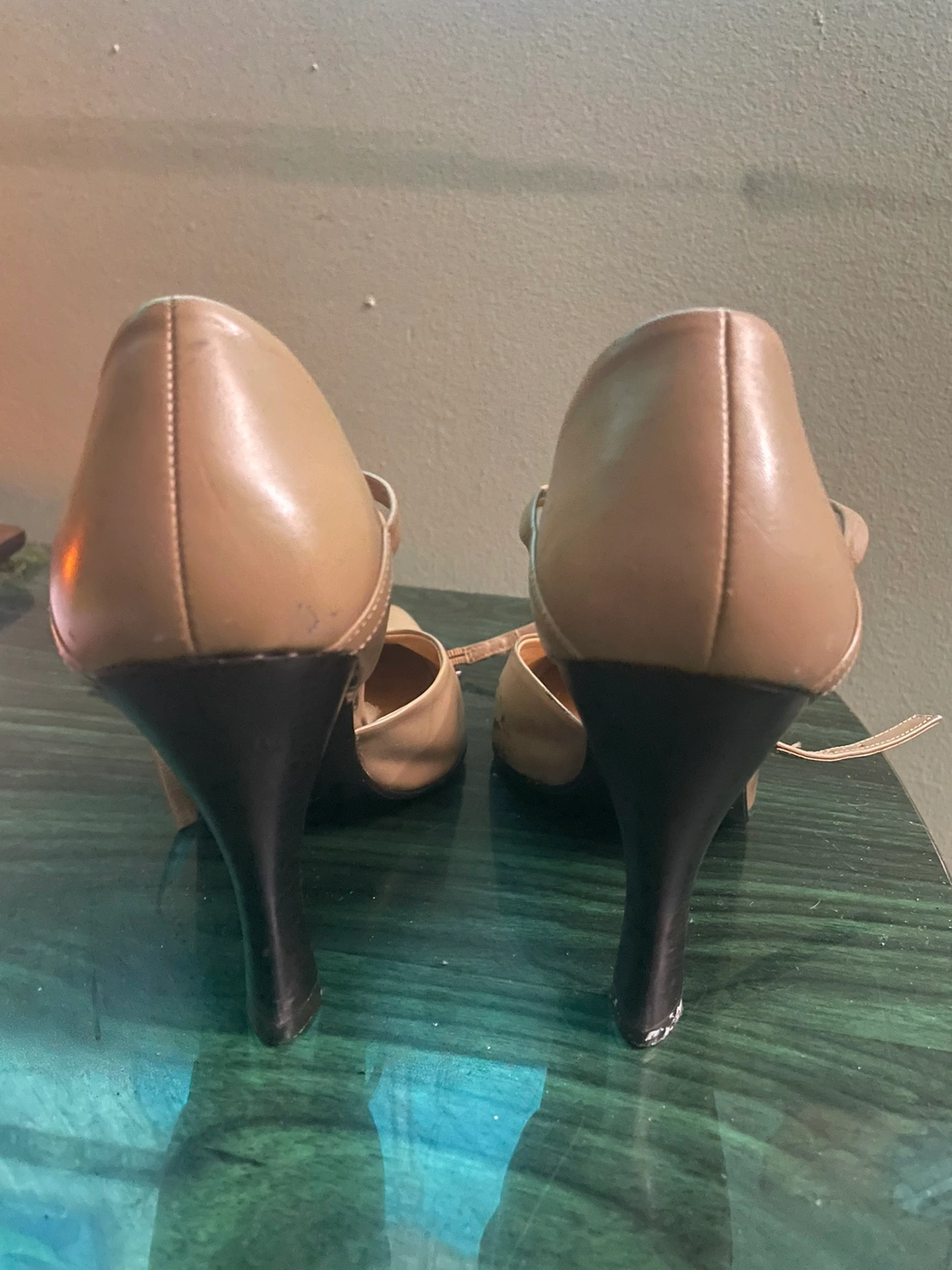Tan leather heels with black heels They are ankle strap and have a pointed toe They are definitely worn and have wear and tear from walking but they’re in good condition