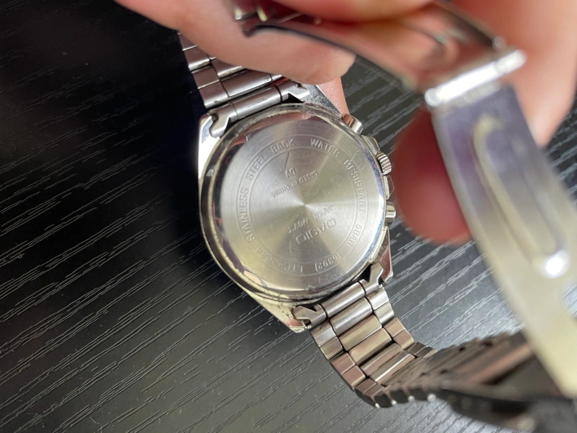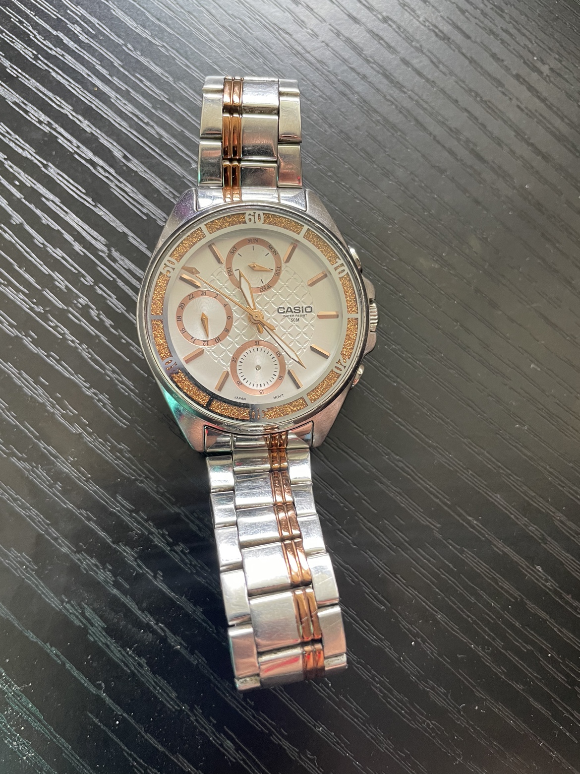 84This is a Casio Chronograph watch with a silver and rose gold band. The watch has a white face with gold accents. The watch is in perfect order. It is a quartz watch made in Japan. It has a stainless steel back. The watch band is adjustable.