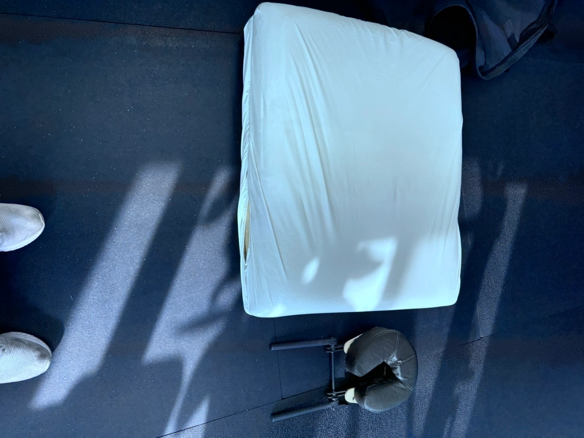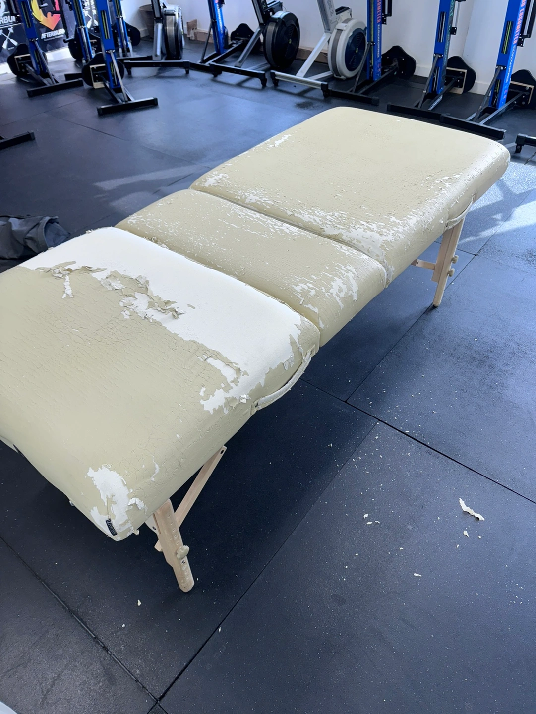 60Portable massage table that folds up for easy storage and transport. Includes carrying bag, headrest, and face cradle. Just needs to be reupholstered or you can use sheets