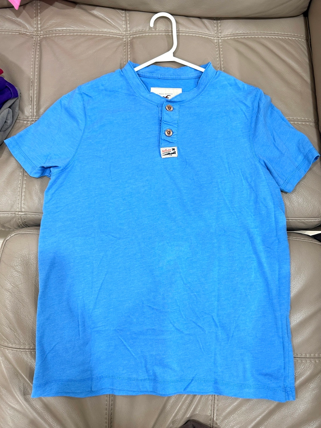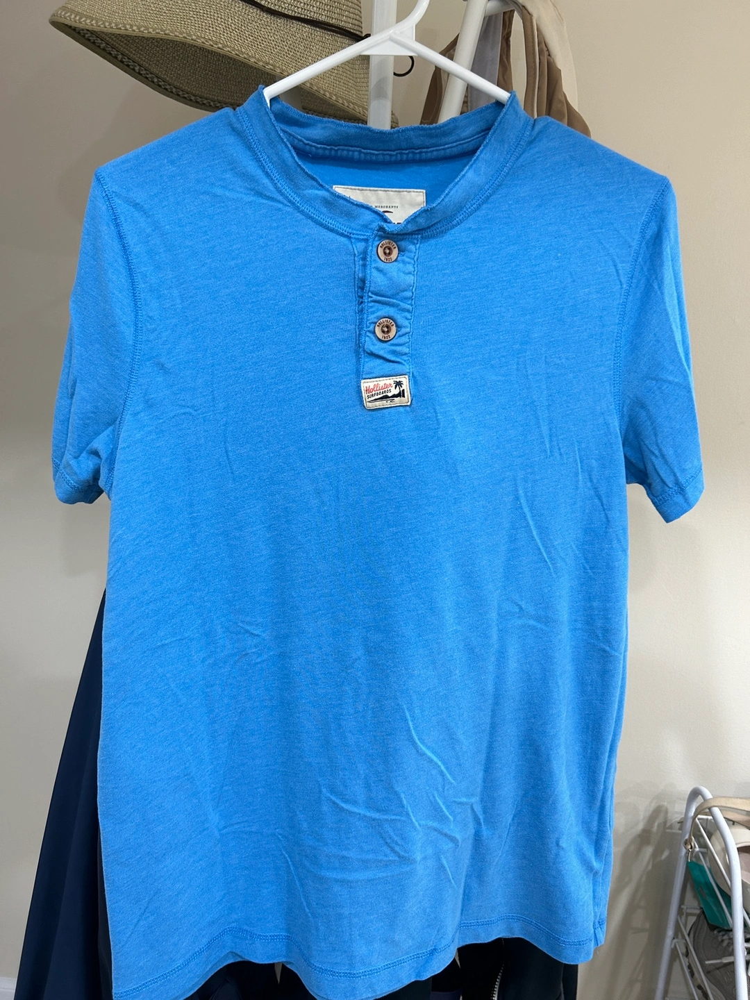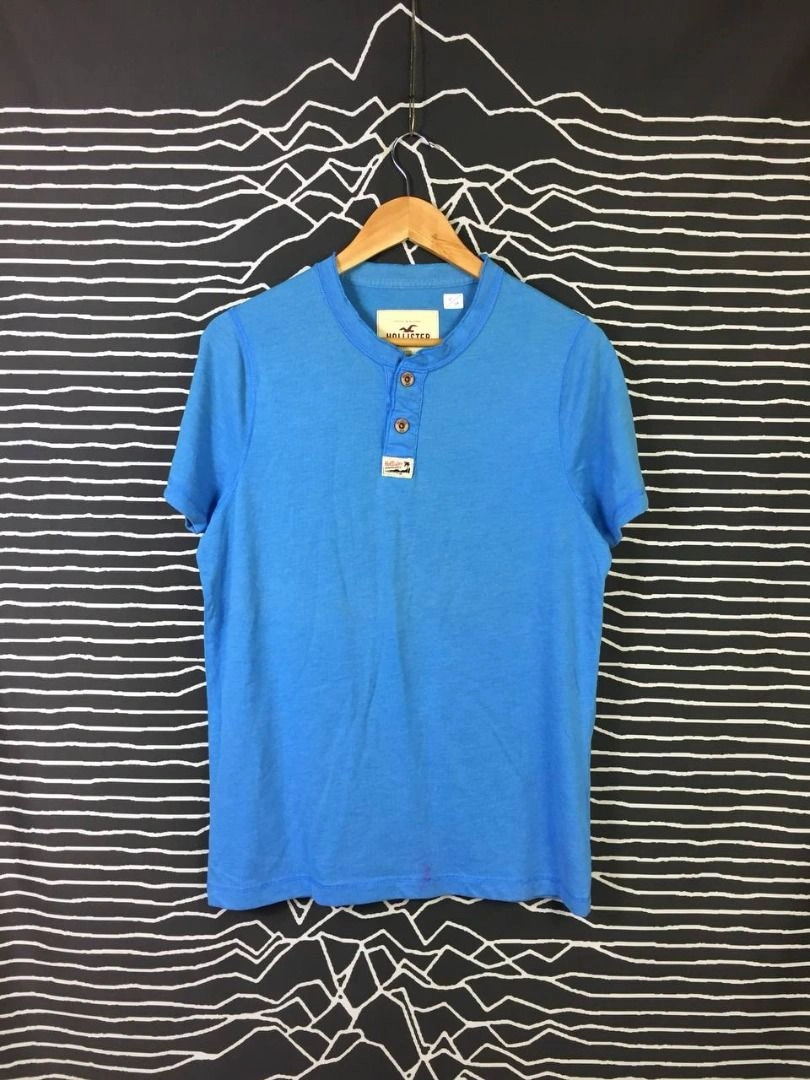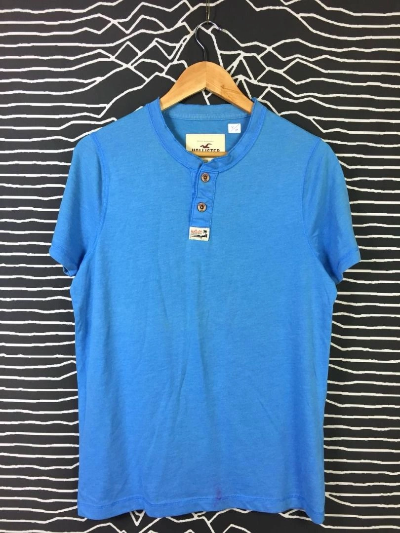 Blue short-sleeved t-shirt with a button placket and a small Hollister logo patch on the front.