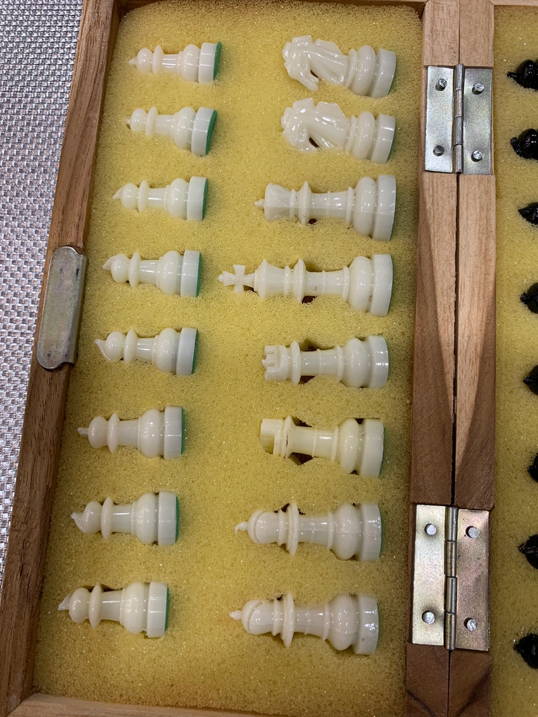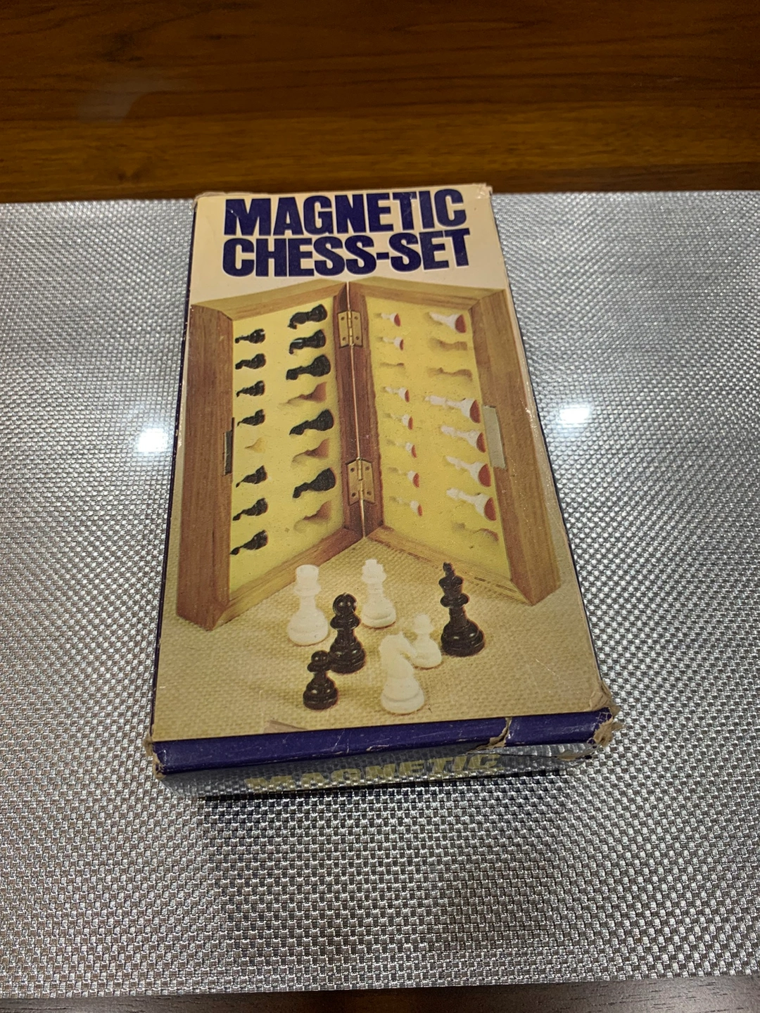 This vintage chess set is in good condition for its age. Likely from the 1960’s it measures 7 & 3/4” by 8” and is 7/8” deep when open. It folds in half, has a magnetic closure and brass hinges. The board is also magnetized and it holds the chess pieces in place on the board. Chess pieces all have the original felt on the base and are stored inside the wood box in yellow foam. This is a complete set, no missing pieces and it comes in the original box. Pick up in Thornhill near Yonge Street in Royal Orchard Boulevard . If you like, this item view my other listings for more vintage and unique finds.