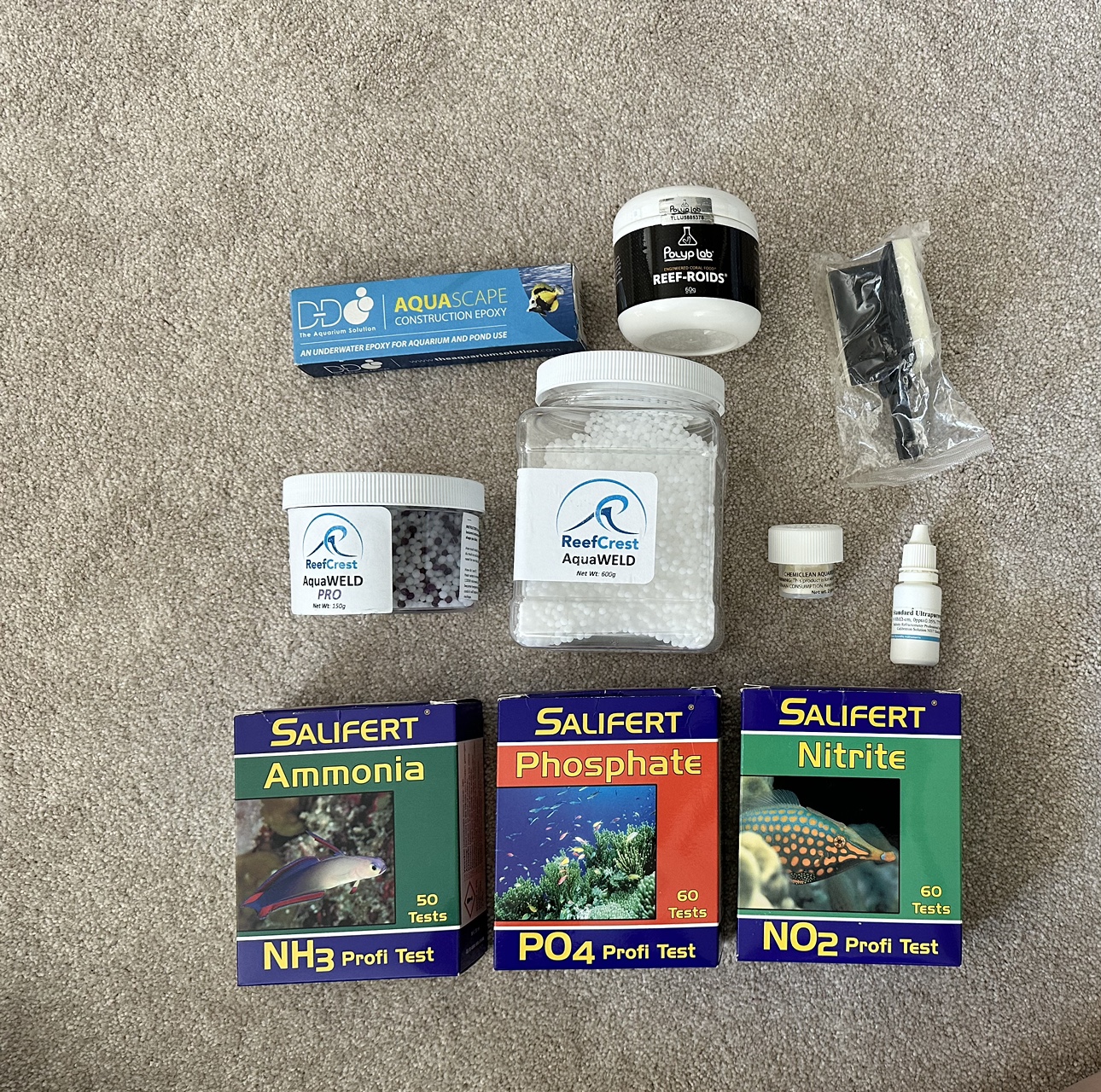 Various aquarium supplies including epoxy, reef-roids, aqua-weld, and test kits.