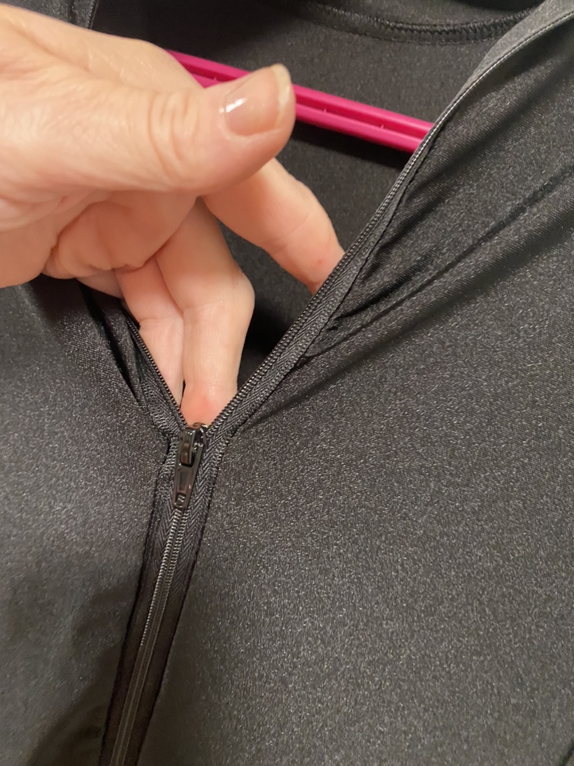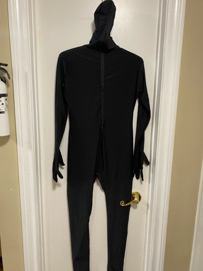 Halloween full body suit with long sleeves, a hood, and a full zipper up the back. We’re over your head, completely zips up all the way to the front. Size Large, fits teen/ladies