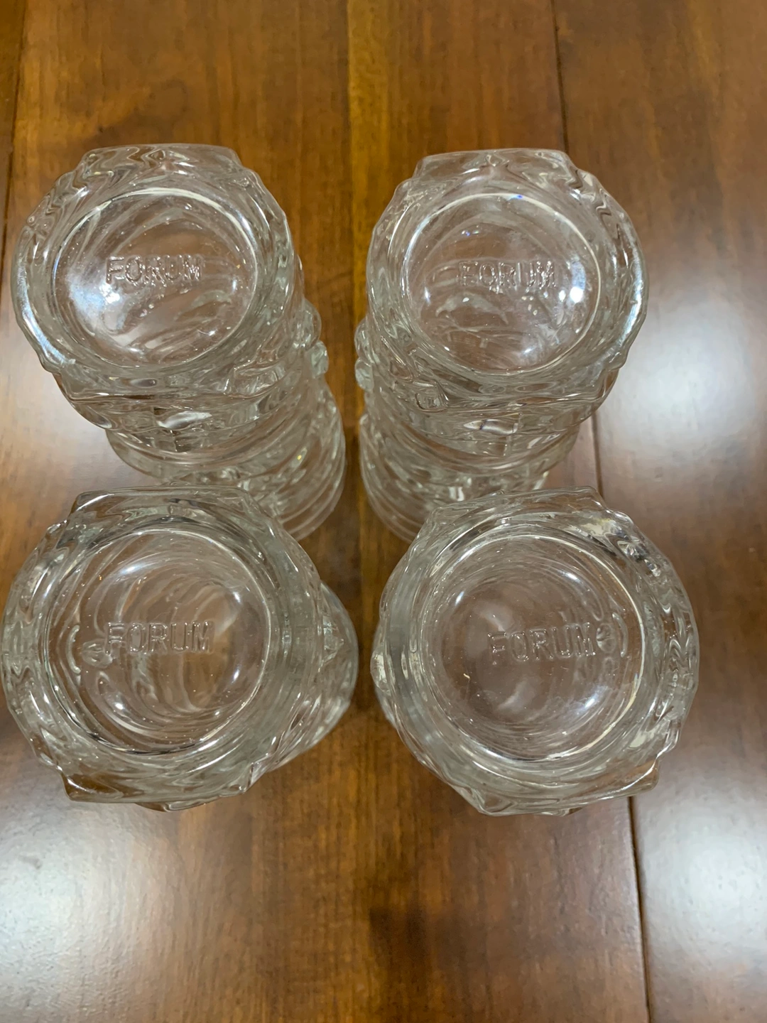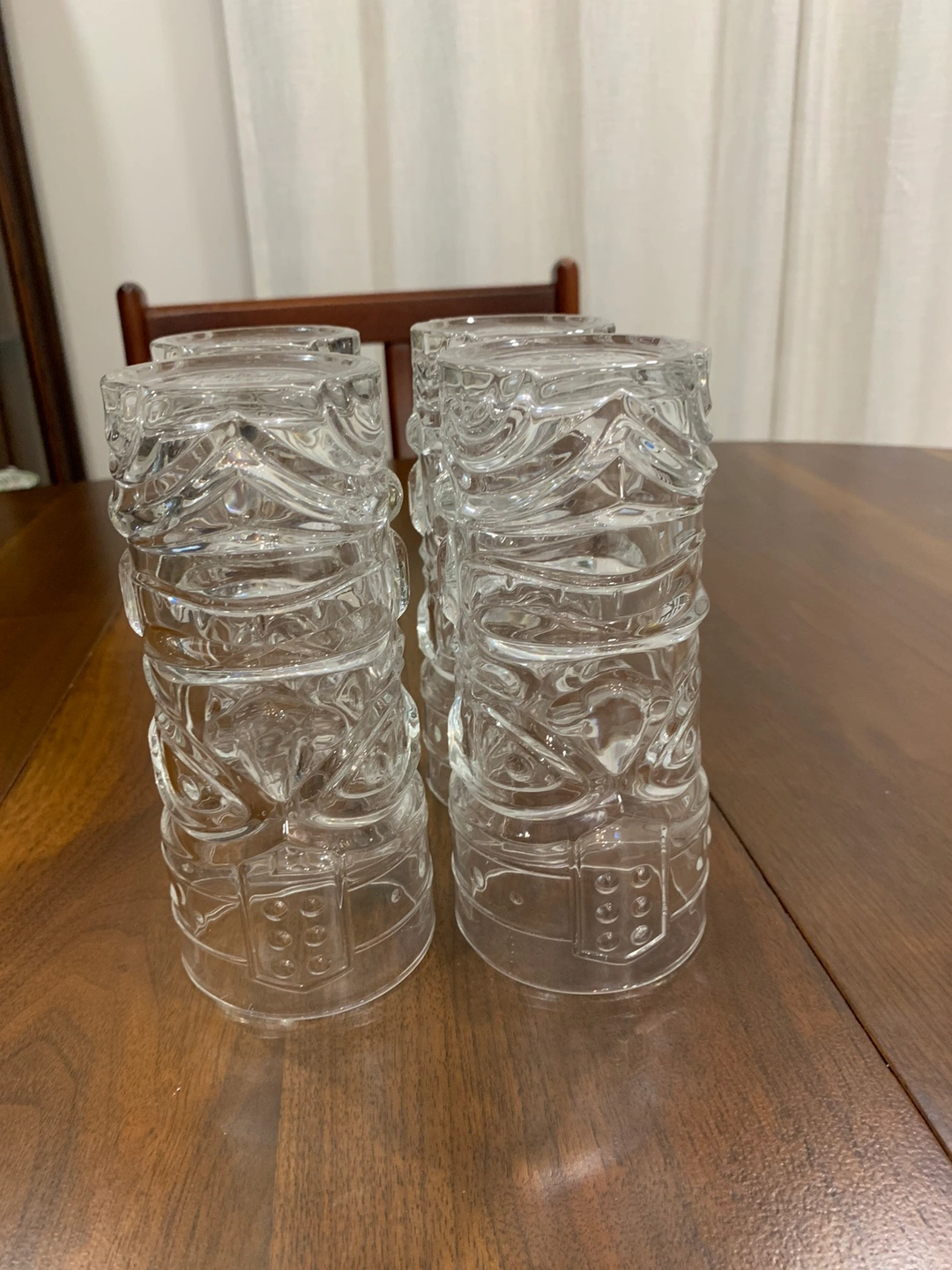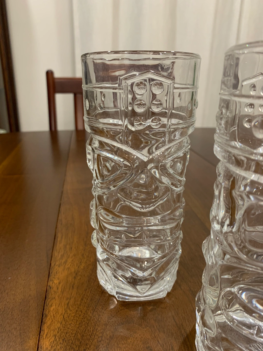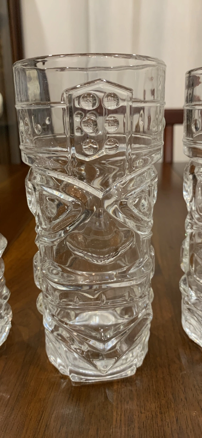 These vintage Tiki drinking glasses from Forum are a must-have for any collector or fan of Polynesian style. The clear glass and double-faced design make it a unique addition to any kitchen or bar. Measuring 6.5 inches in height, they’re perfect for serving cold beverages like iced tea or cocktails. Add them to your collection of glassware. They are marked Forum on the bottom.