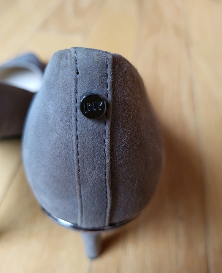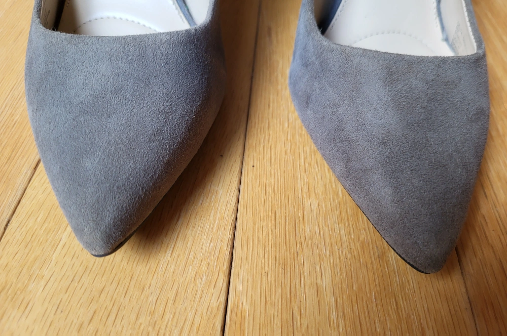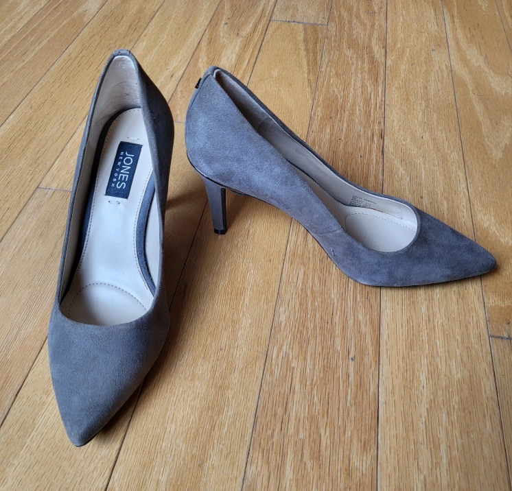 Jones New York ladies grey suede pumps with a pointed toe and a stiletto heel. The heels are approximately 2 inches tall.