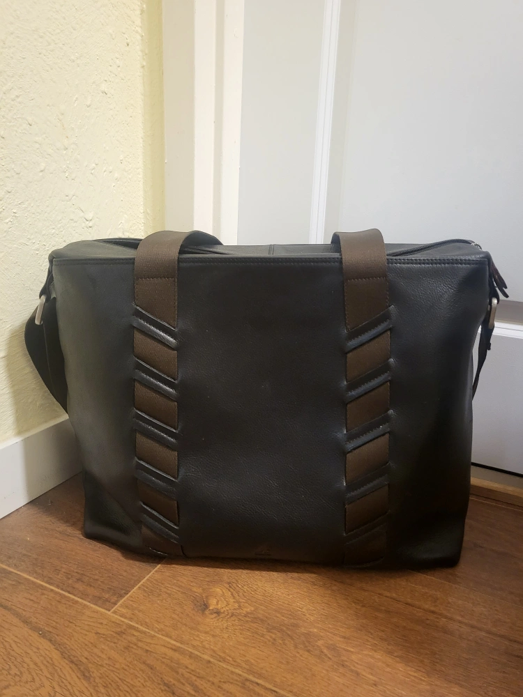 Real leather weekender or travel bag. This bag packs a ton! Very large and stylish. A padded laptop compartment inside. 18" x 13" x 5" WHD