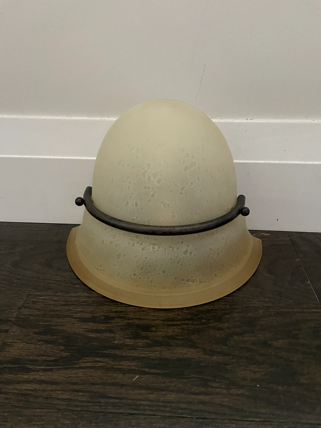 This light fixture is in good condition. It is a round, frosted glass light with a brown metal base. Includes 1 light bulb
