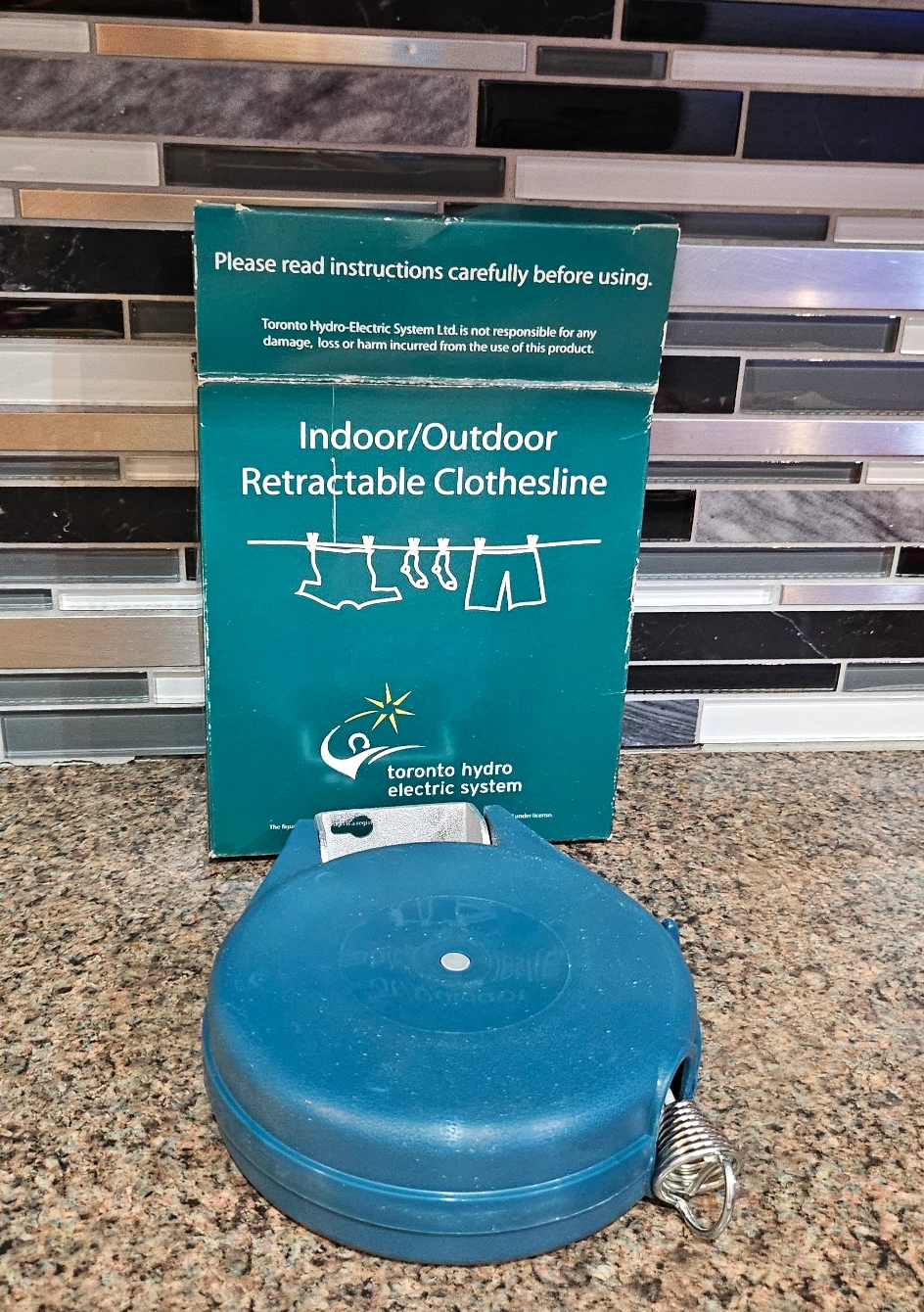 44 feet long Toronto Hydro Electric System Retractable Clothesline. Suitable for indoor or outdoor use. Never been used.