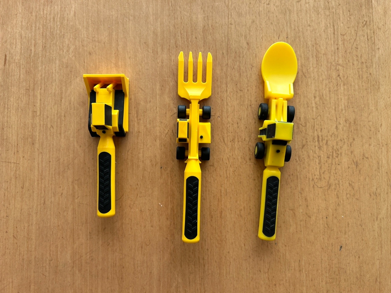 A set of 3 construction vehicle themed utensils - a fork, a spoon, and a knife. The utensils are yellow with black details. Each utensil has a different construction vehicle design on the handle. $5
