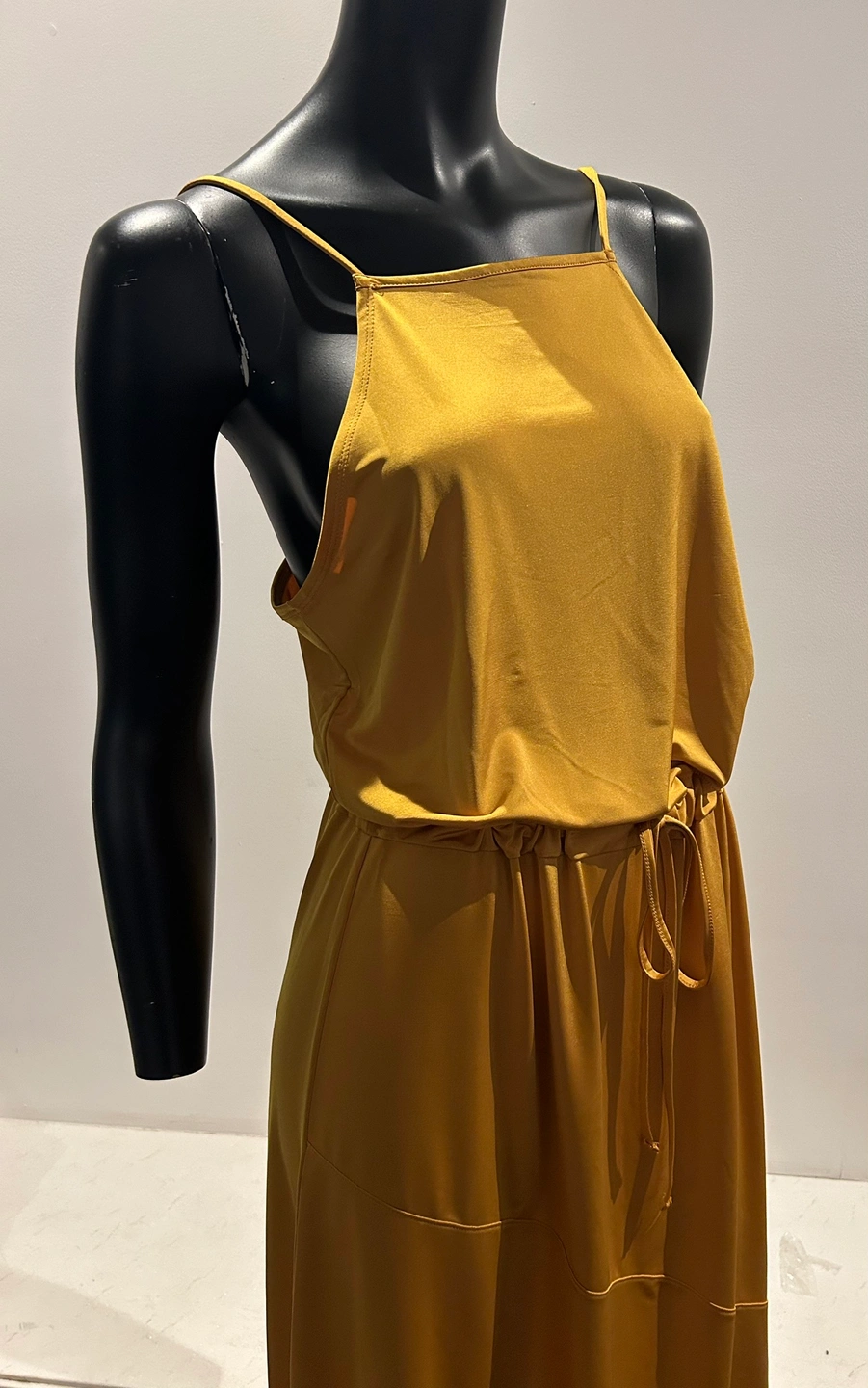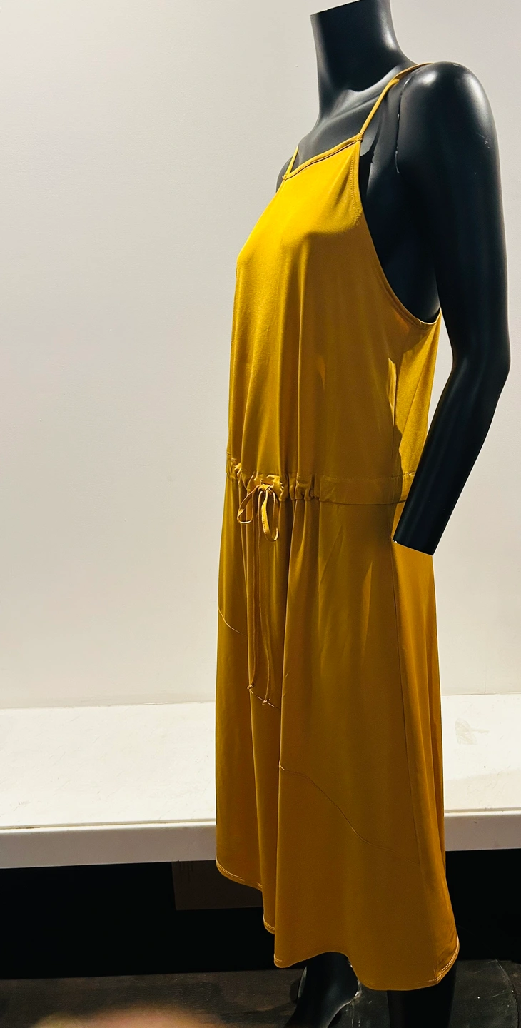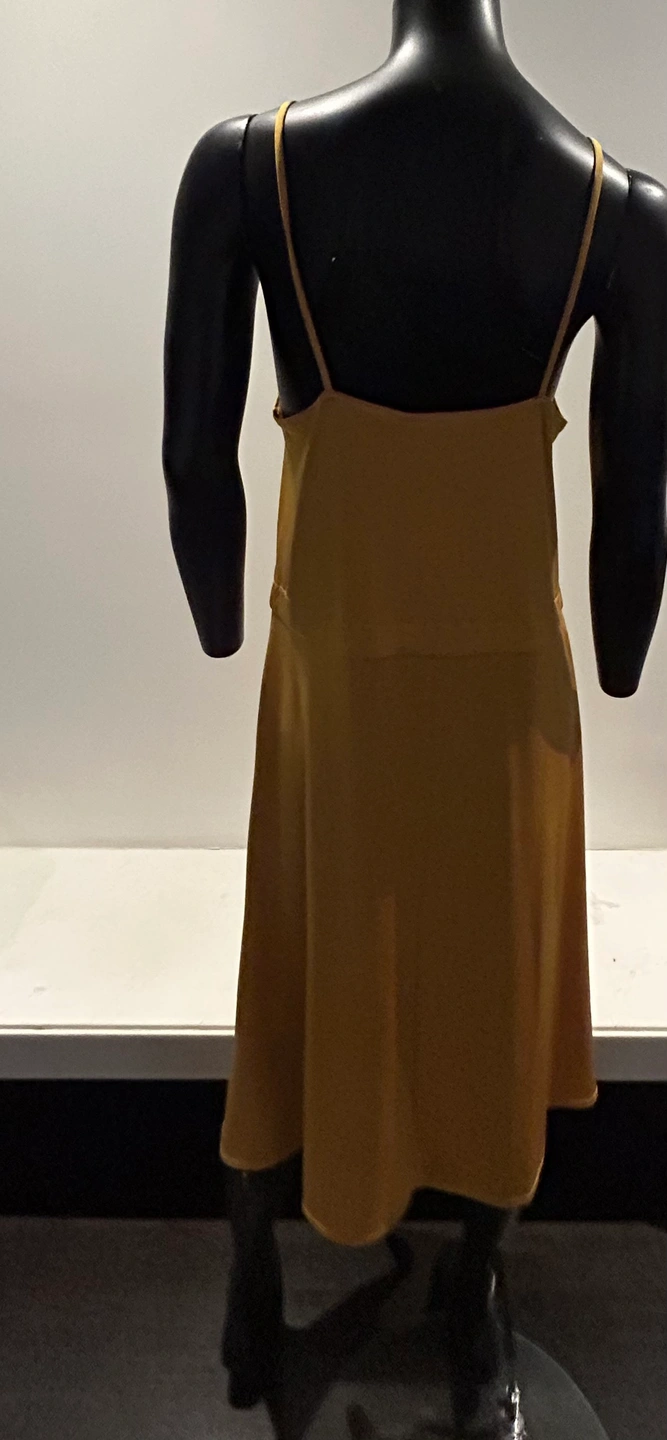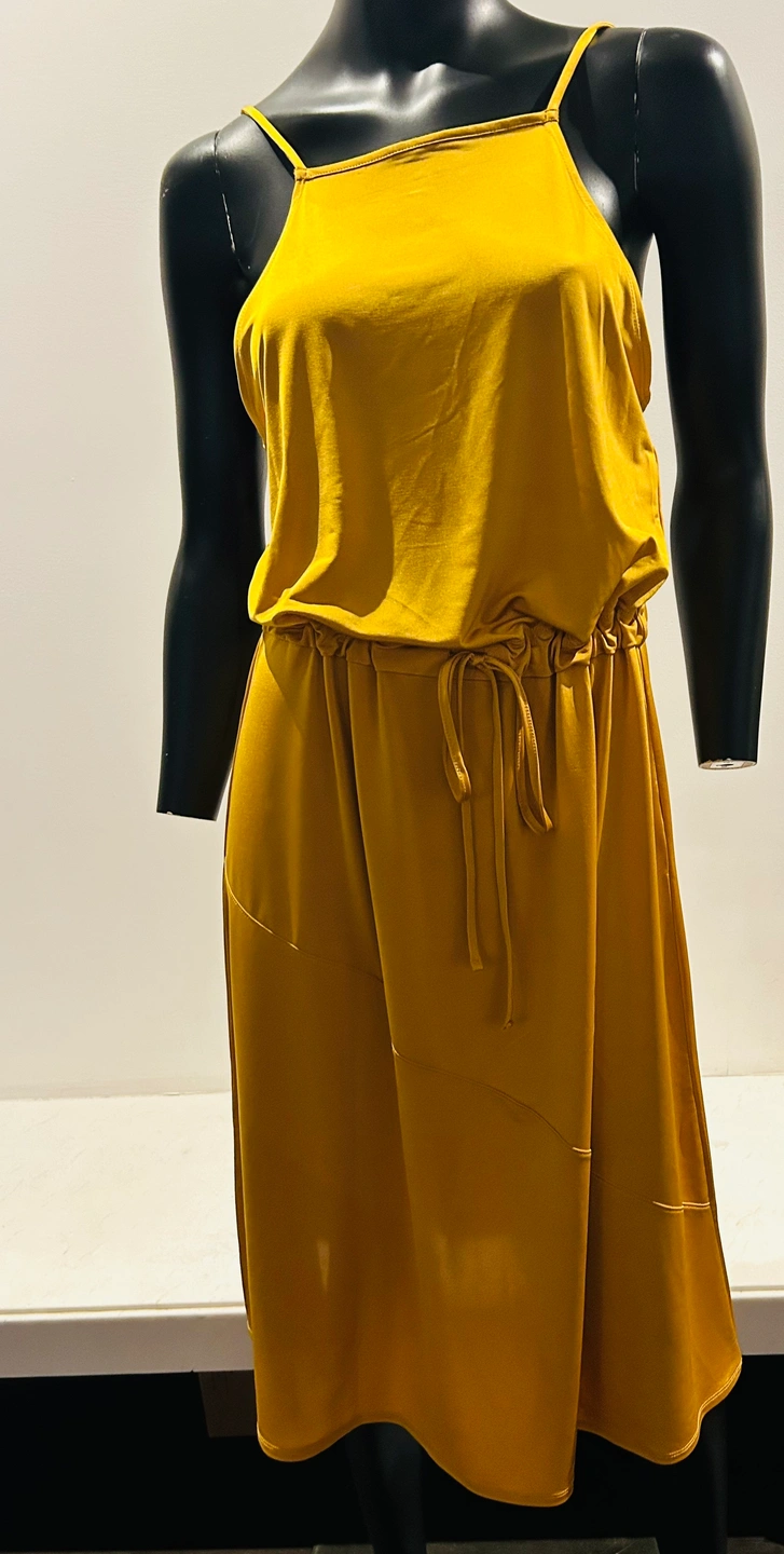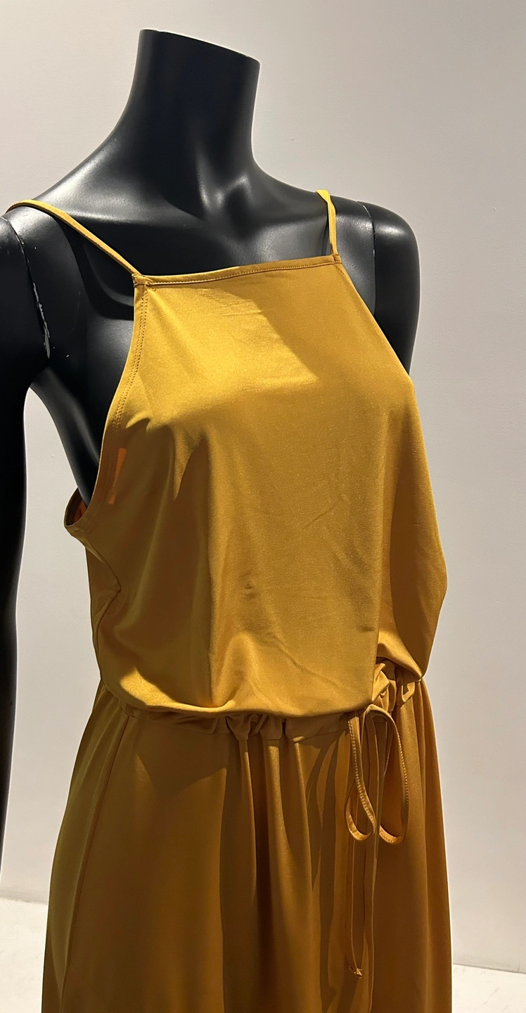 A beautiful mustard yellow maxi dress with a tie waist. The dress has a square neckline and thin straps. It is a loose-fitting, flowy style. New with tags Zara silky burnt yellow dress. So pretty and flattering. Medium. Tie at waist if you want to wear it cinched. Can also leave it loose. Good as summer dress or layering. Even over turtle neck and black or brown boots in winter. So comfortable and flattering cut.