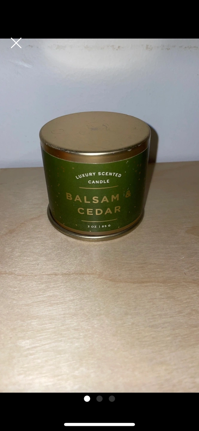 Small candle in a tin with a green and gold label and lid. The candle is unscented. The candle is 3 oz or 85 g. It is in its original packaging. The candle was never lit.