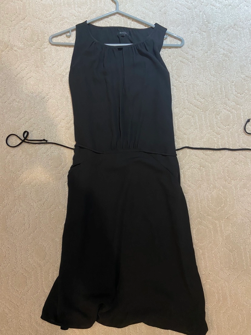 Sleeveless black dress with a tie at the waist. It has a slight v cut in the front for the chest. This dress is in almost new condition and is great as a staple little black dress