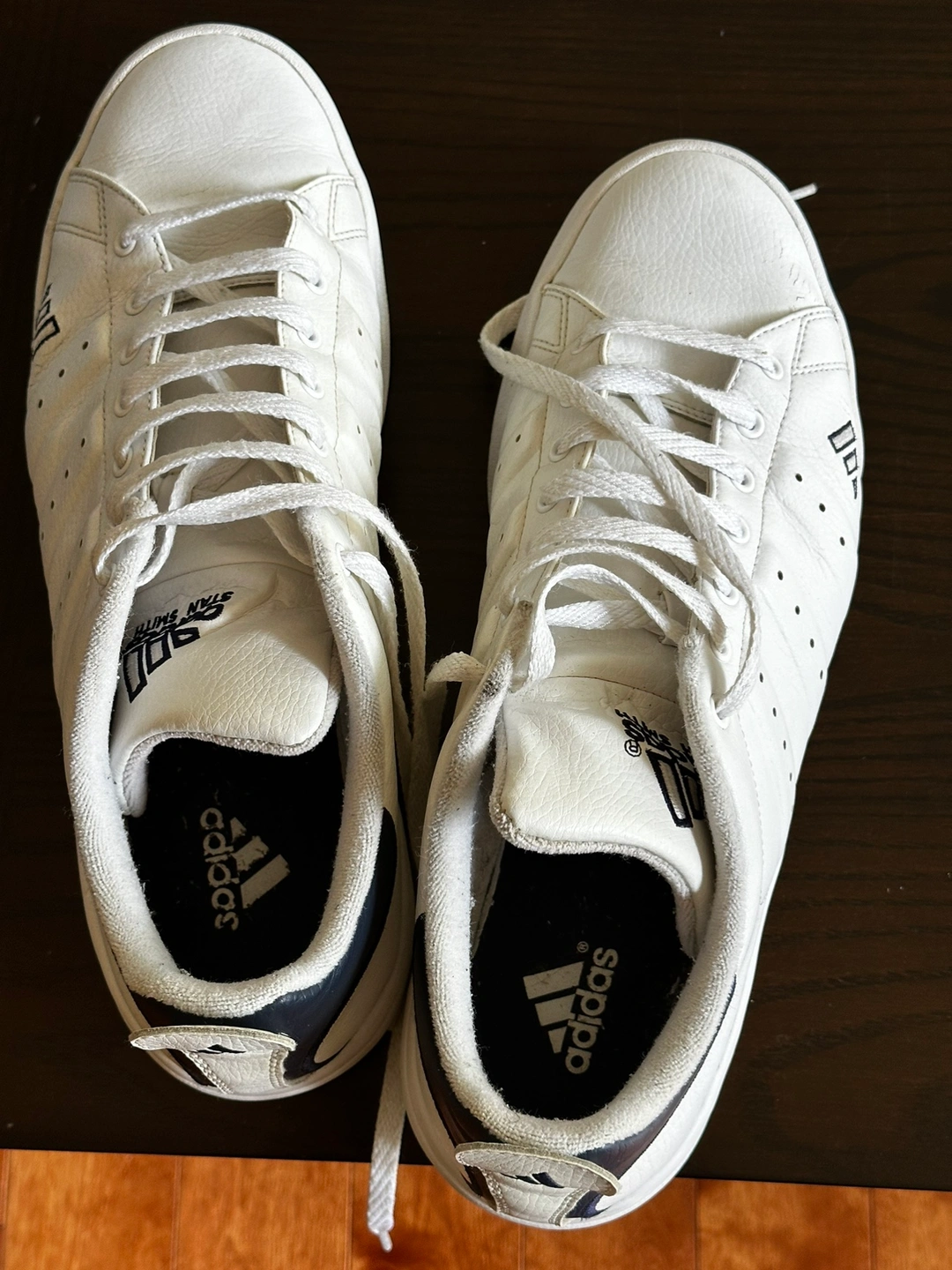 White leather shoes with black accents. The shoes have a classic athletic style and would be great for casual wear.